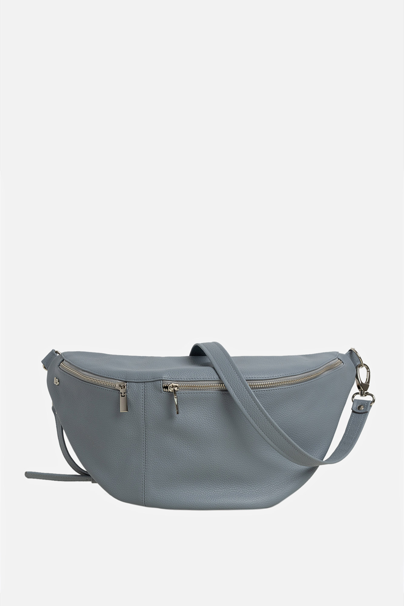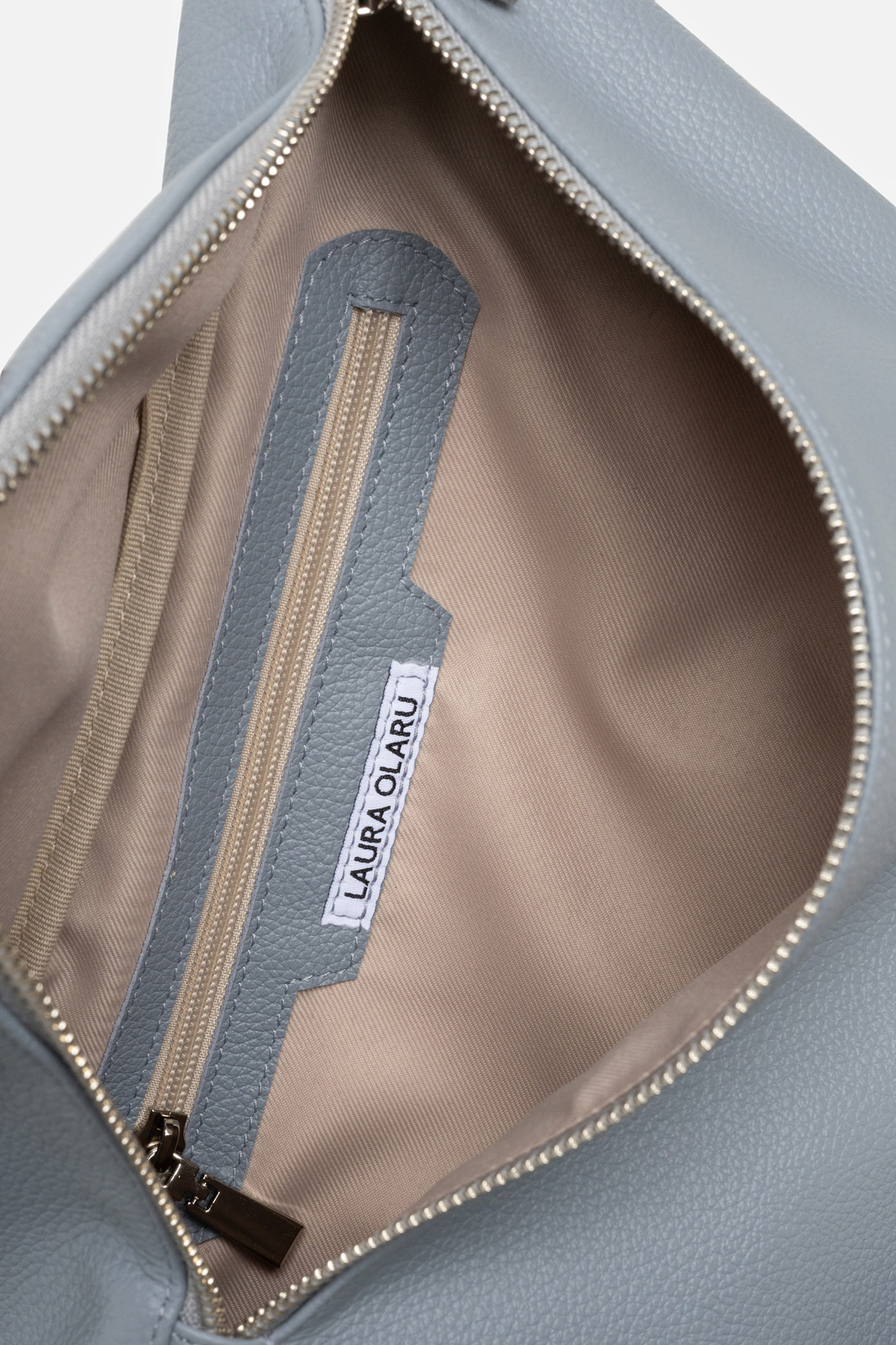 Borseta OTILIA este realizată din piele naturală texturată gri, este căptușită, are buzunar interior, are baretă de umăr reglabilă & detașabilă, aceasta prezintă două compartimente distincte care se închid cu fermoare metalice argintii, însă, la cerere, se poate realiza și cu accesorii aurii.
