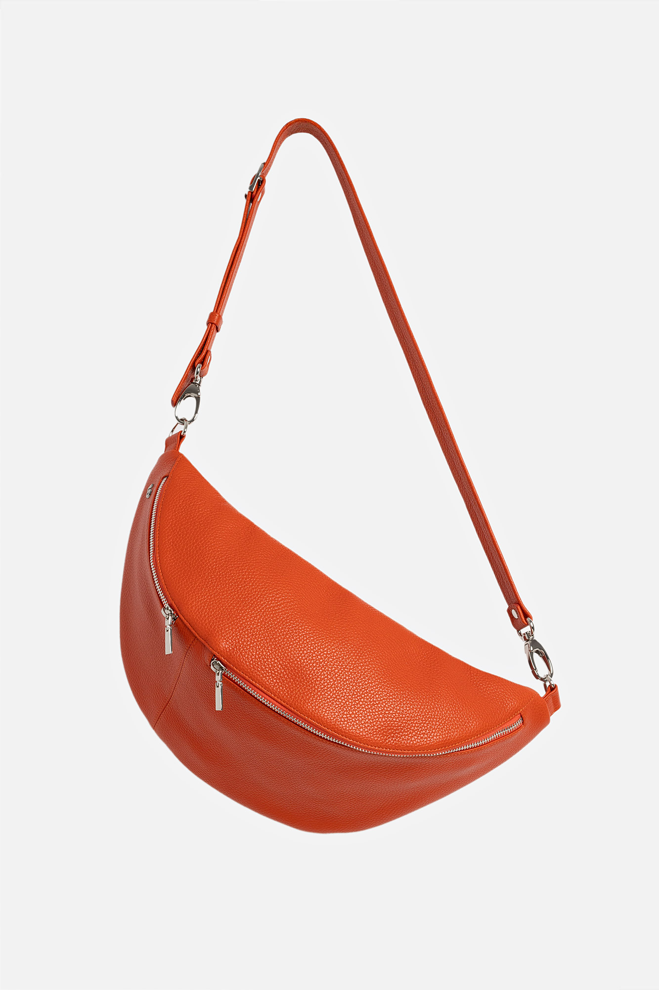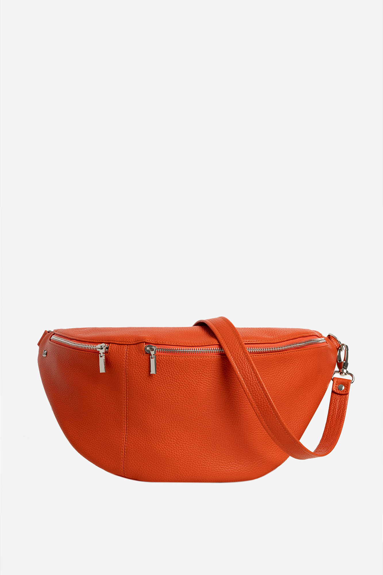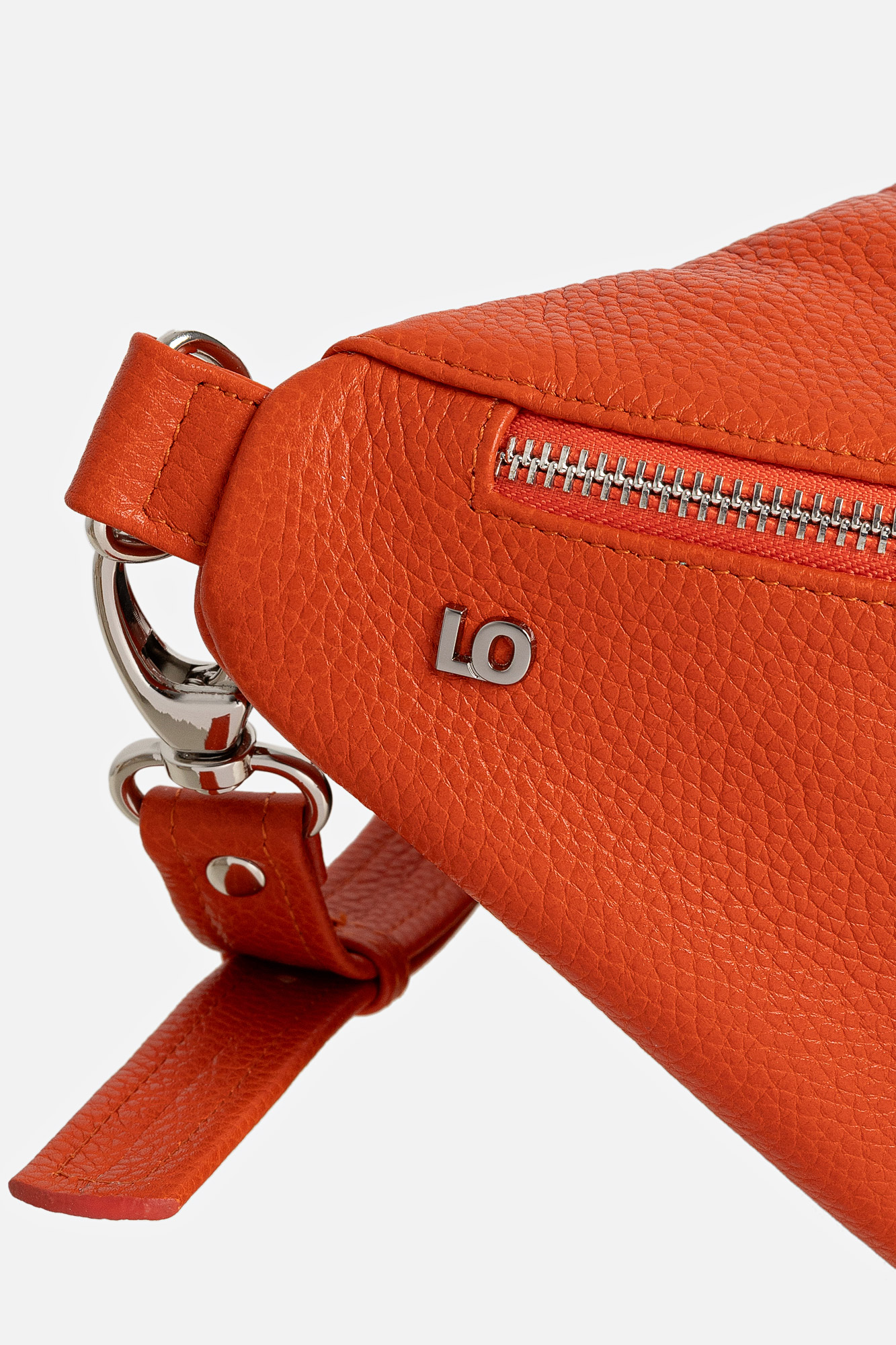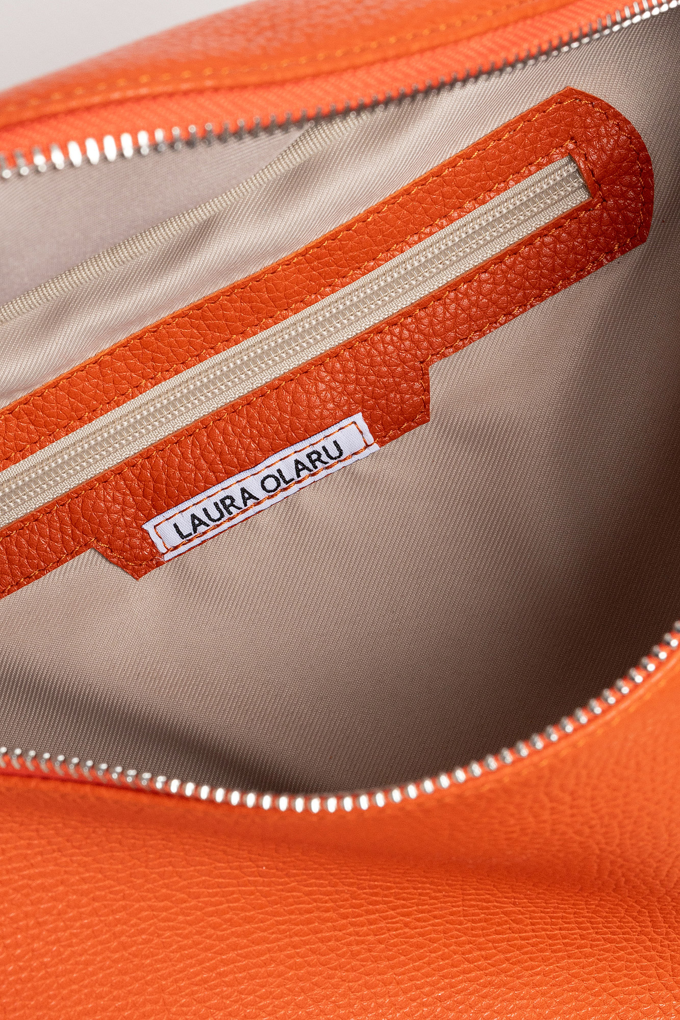 Borseta OTILIA este realizată din piele naturală texturată portocalie, este căptușită, are buzunar interior, are baretă de umăr reglabilă & detașabilă, aceasta prezintă două compartimente distincte care se închid cu fermoare metalice argintii, însă, la cerere, se poate realiza și cu accesorii aurii.