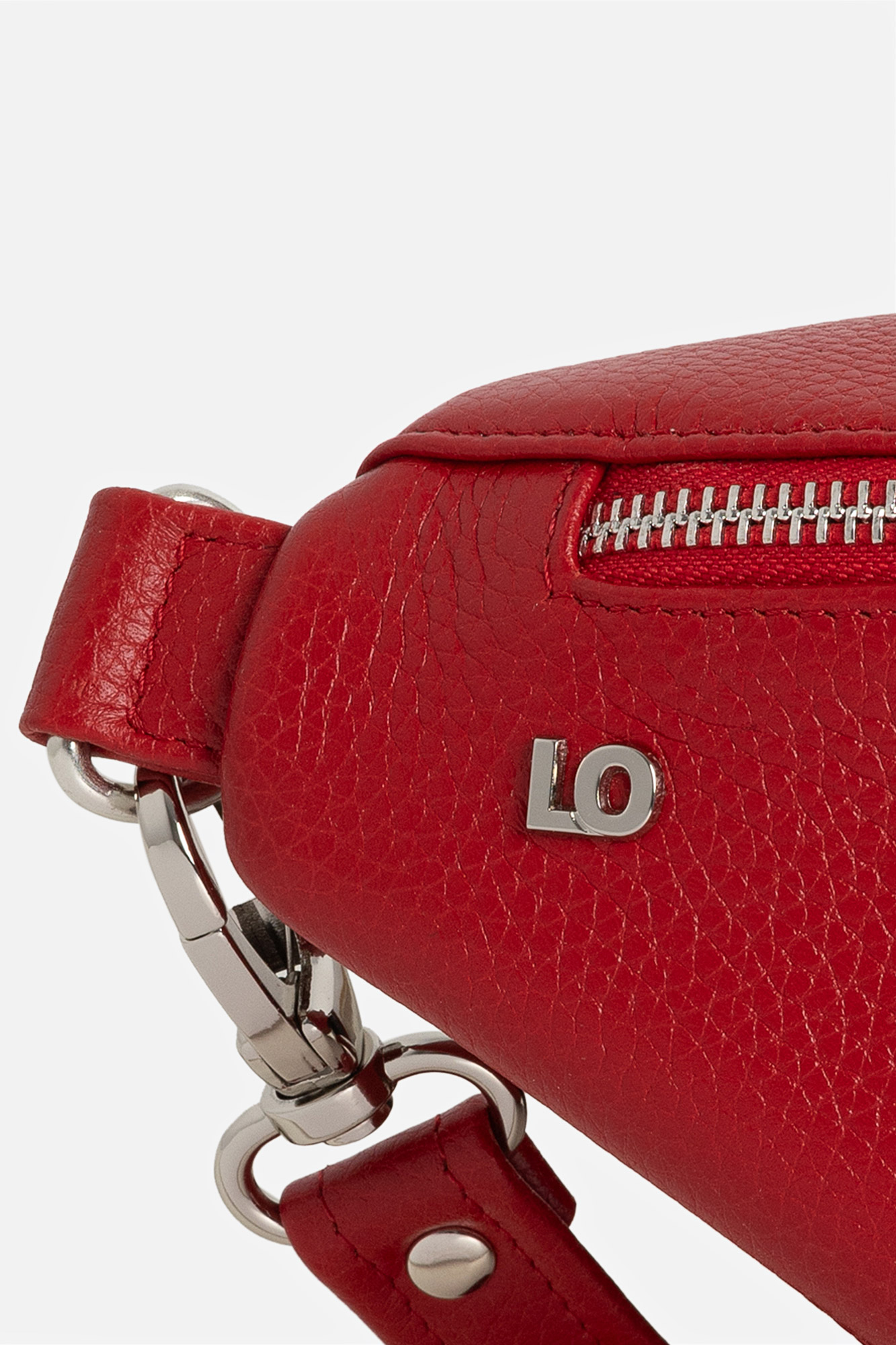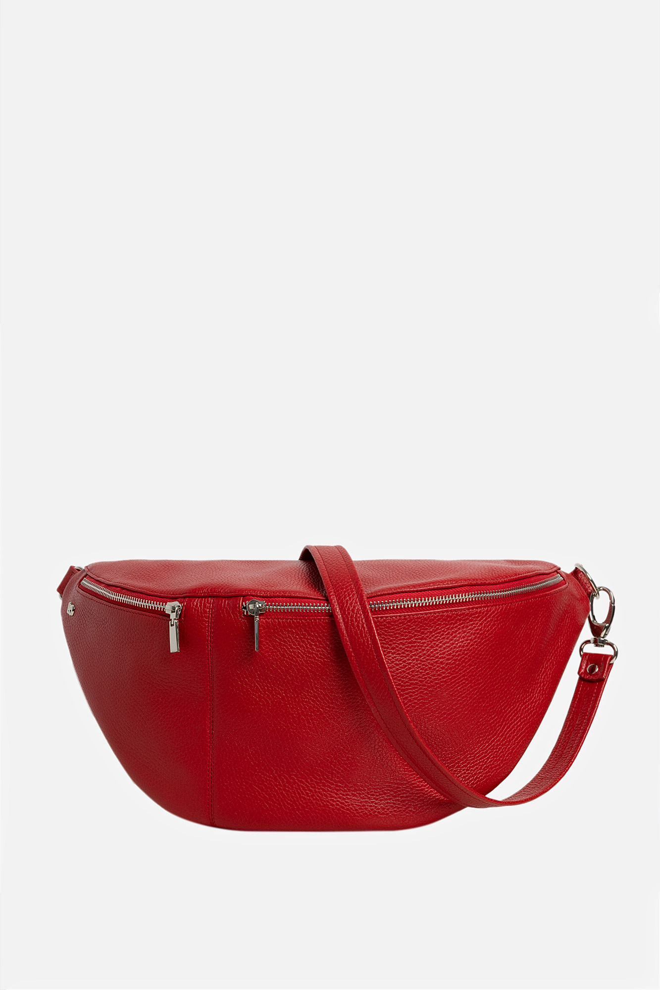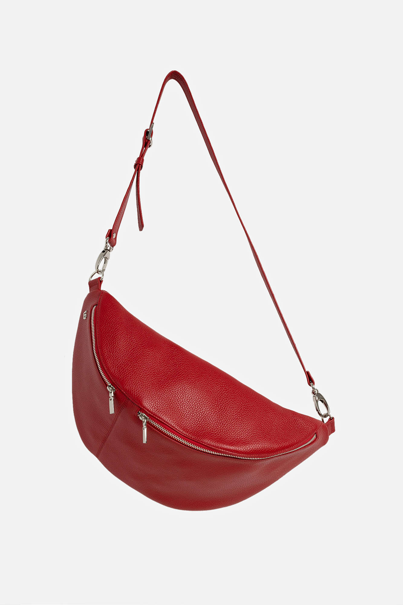 Borseta OTILIA este realizată din piele naturală texturată roșie, este căptușită, are buzunar interior, are baretă de umăr reglabilă & detașabilă, aceasta prezintă două compartimente distincte care se închid cu fermoare metalice argintii, însă, la cerere, se poate realiza și cu accesorii aurii.