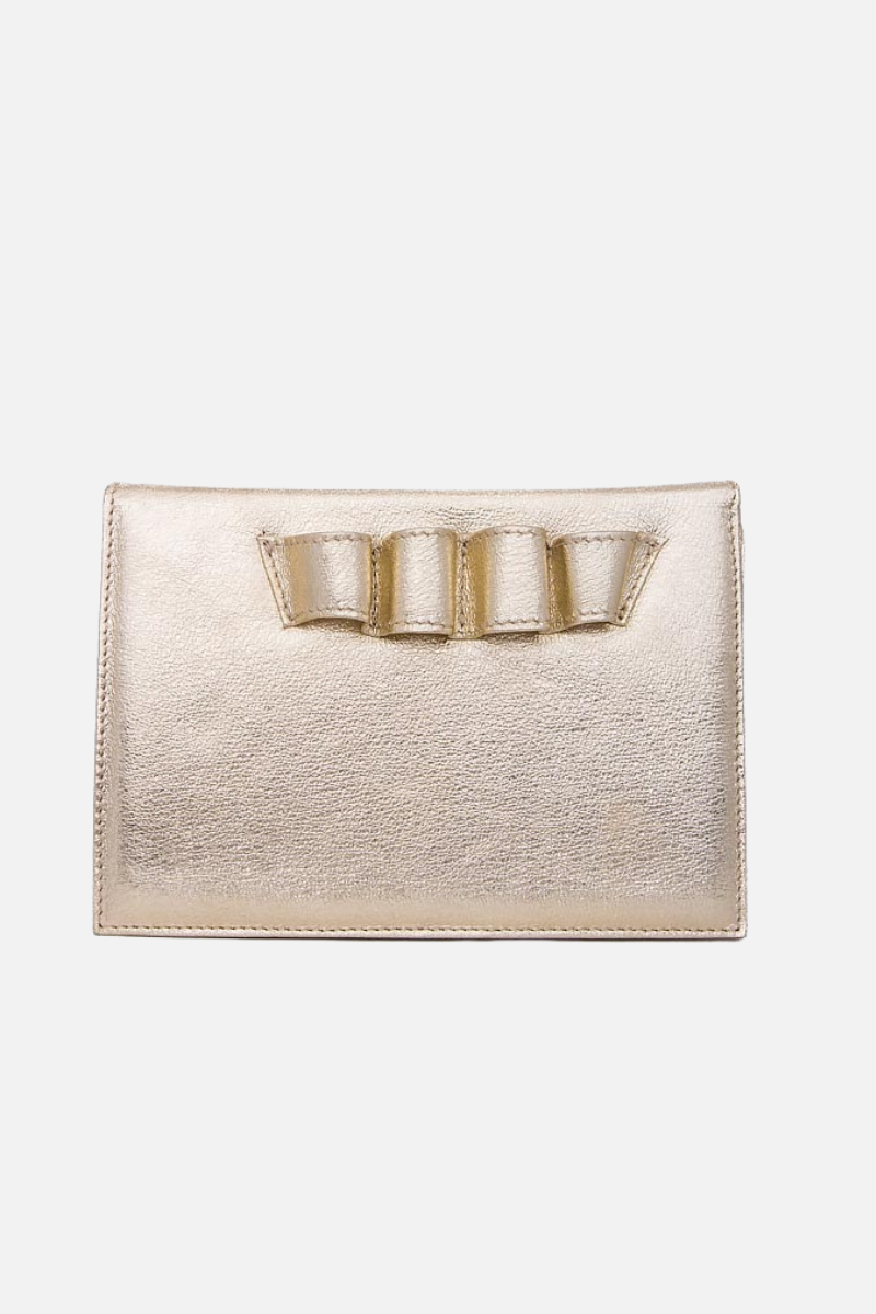 Geanta WENDY este realizată din piele naturală aurie, prezintă un accesoriu inedit anexat capacului, ce susține degetele. Are baretă de umăr detașabilă, se închide cu capsă magnetică și are buzunar interior. Este o piesă superbă, versatilă, pe care o poți integra ușor în ținute casual, dar mai ales elegante.