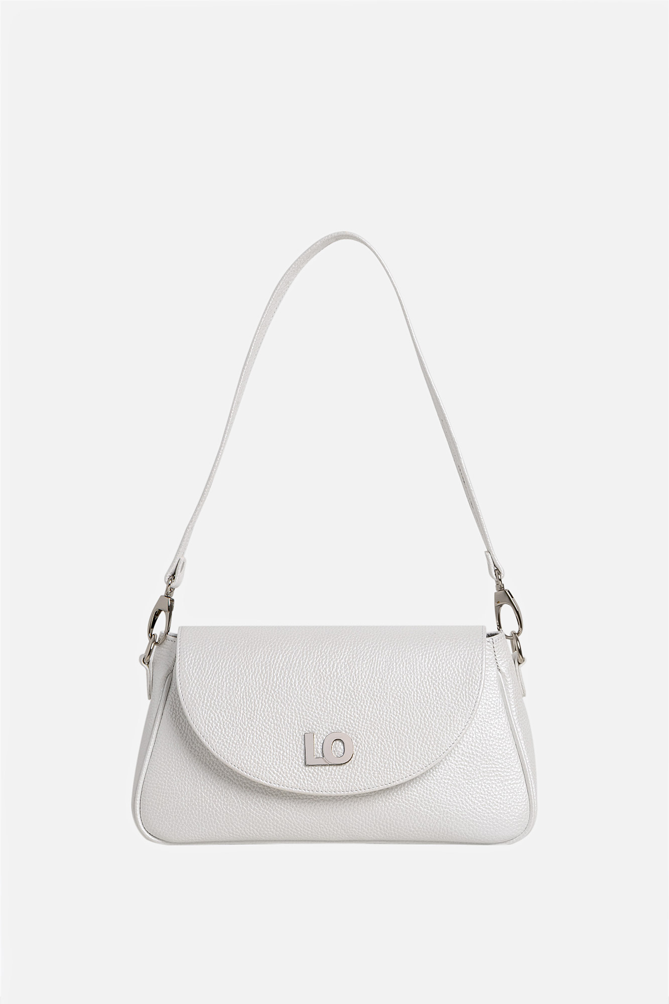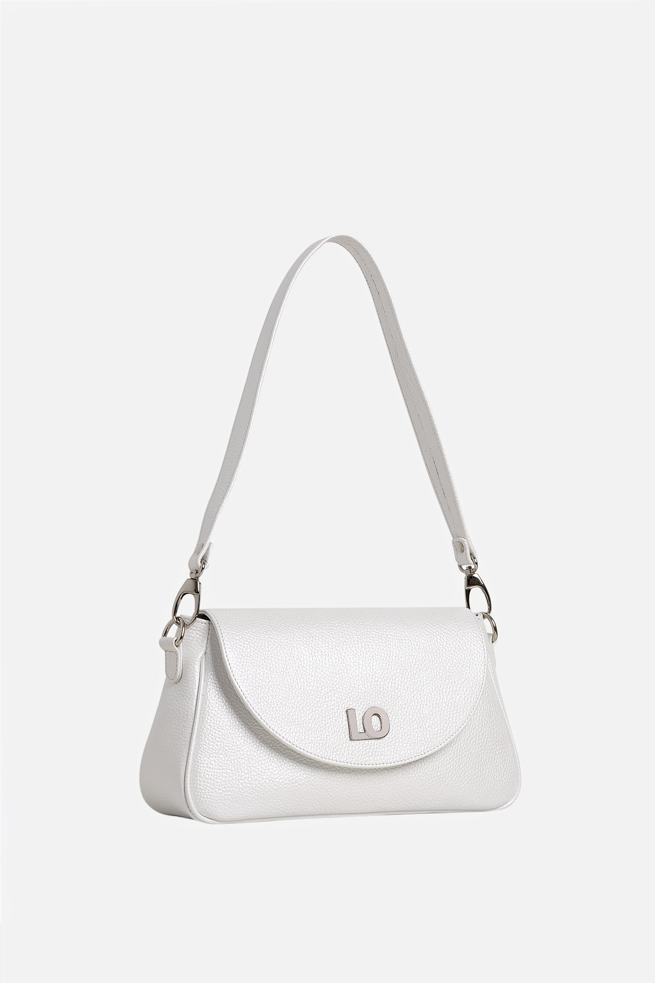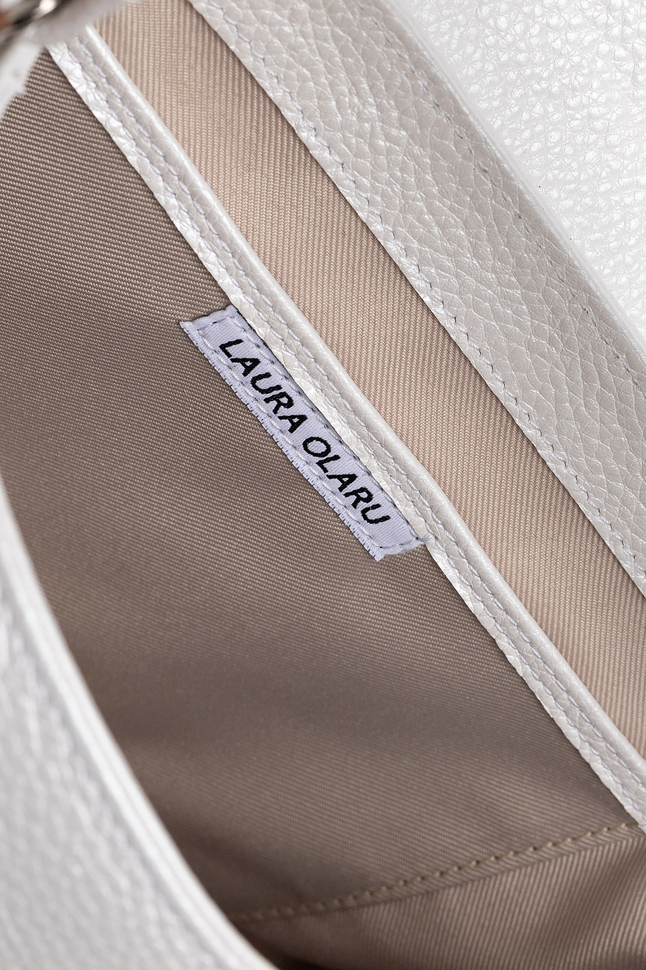 Geanta Leyla este realizată din piele naturală texturată alb perlat. Are un buzunar interior, se închide cu capsă magnetică și este accesorizată cu două barete detașabile: una scurtă și una lungă, reglabilă.