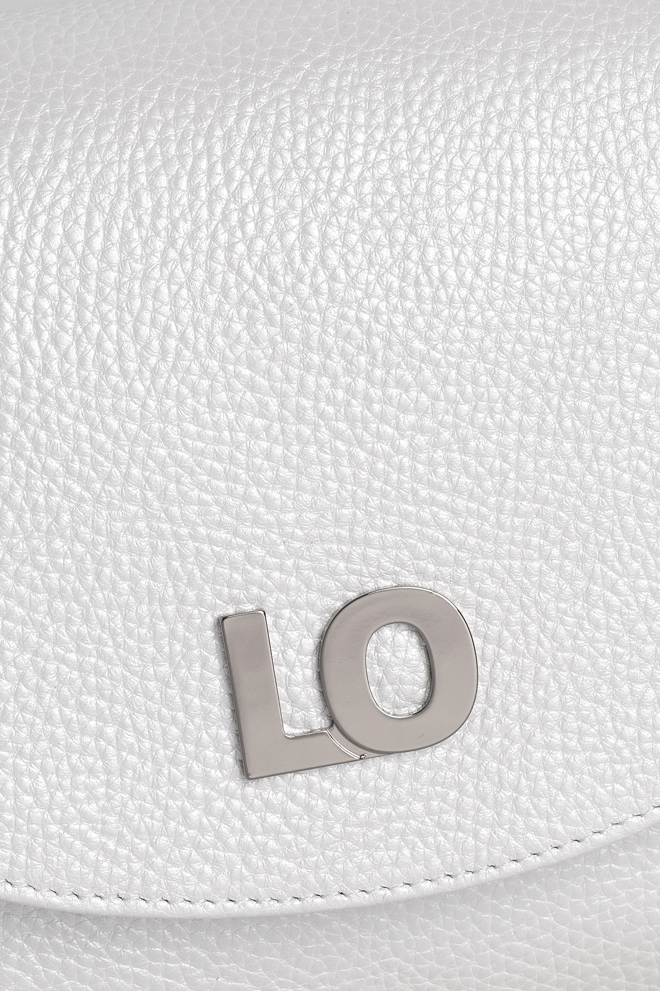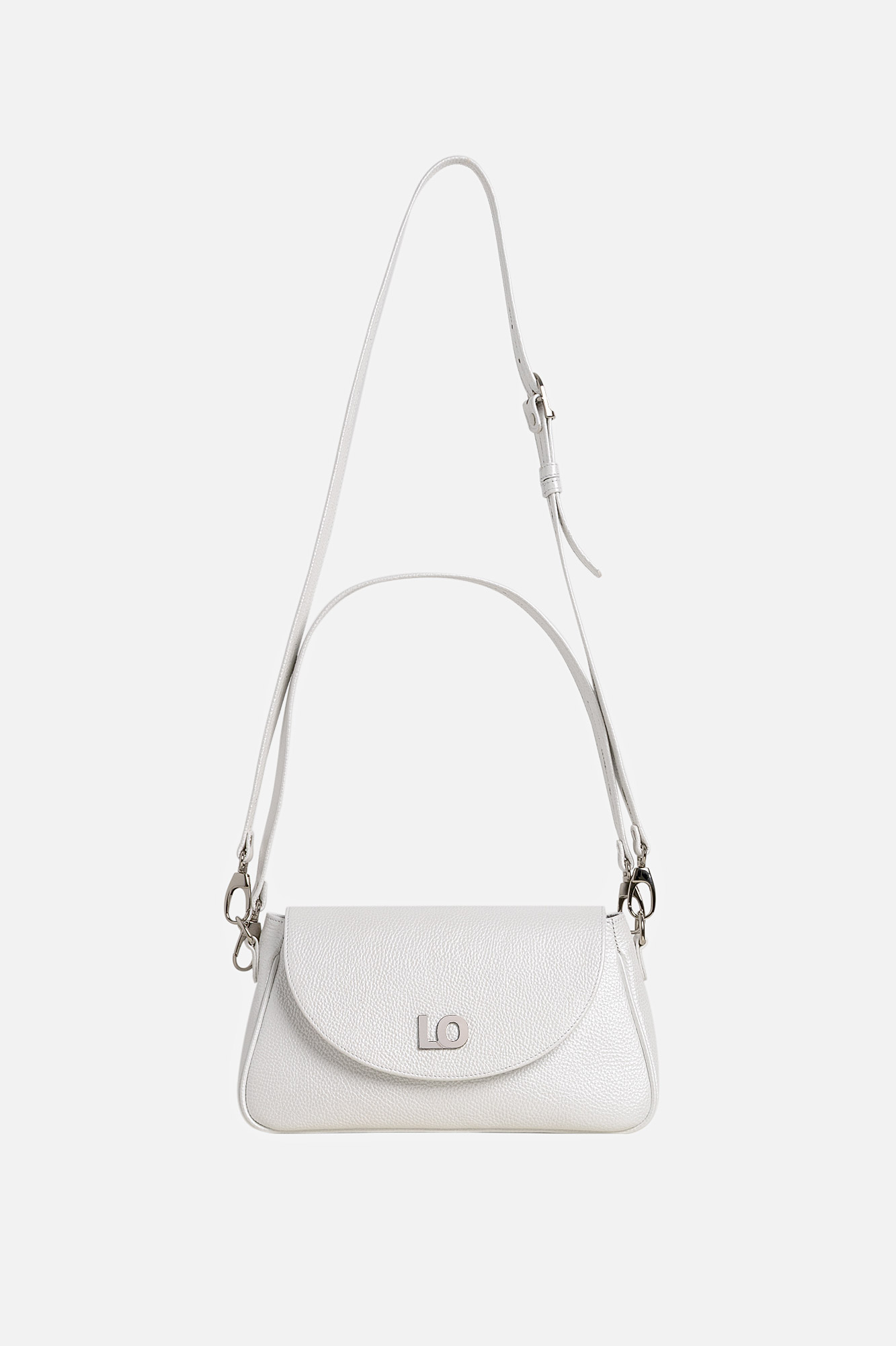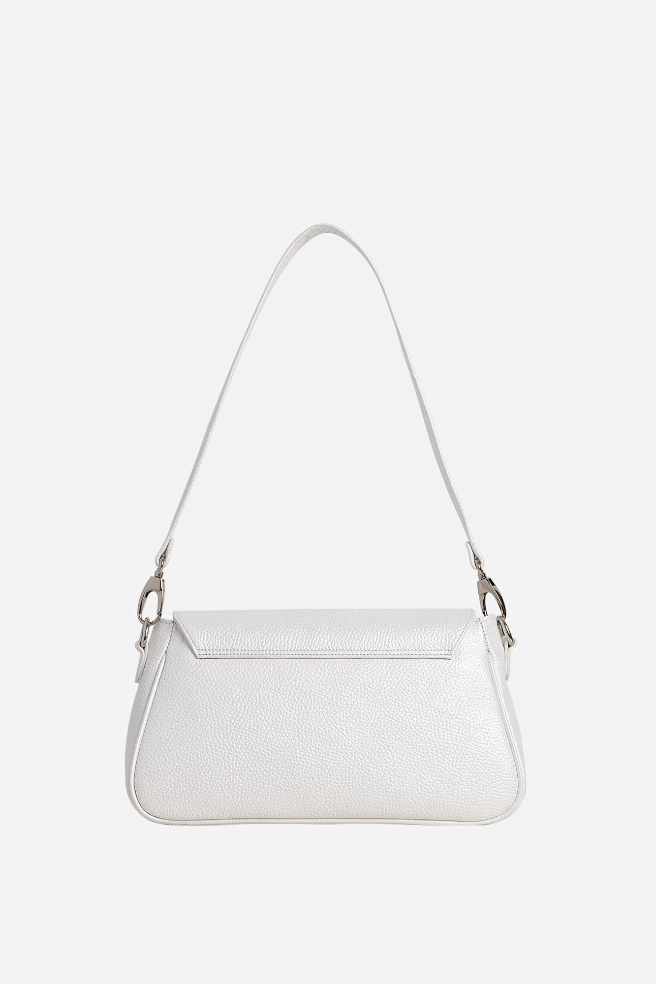Geanta Leyla este realizată din piele naturală texturată alb perlat. Are un buzunar interior, se închide cu capsă magnetică și este accesorizată cu două barete detașabile: una scurtă și una lungă, reglabilă.