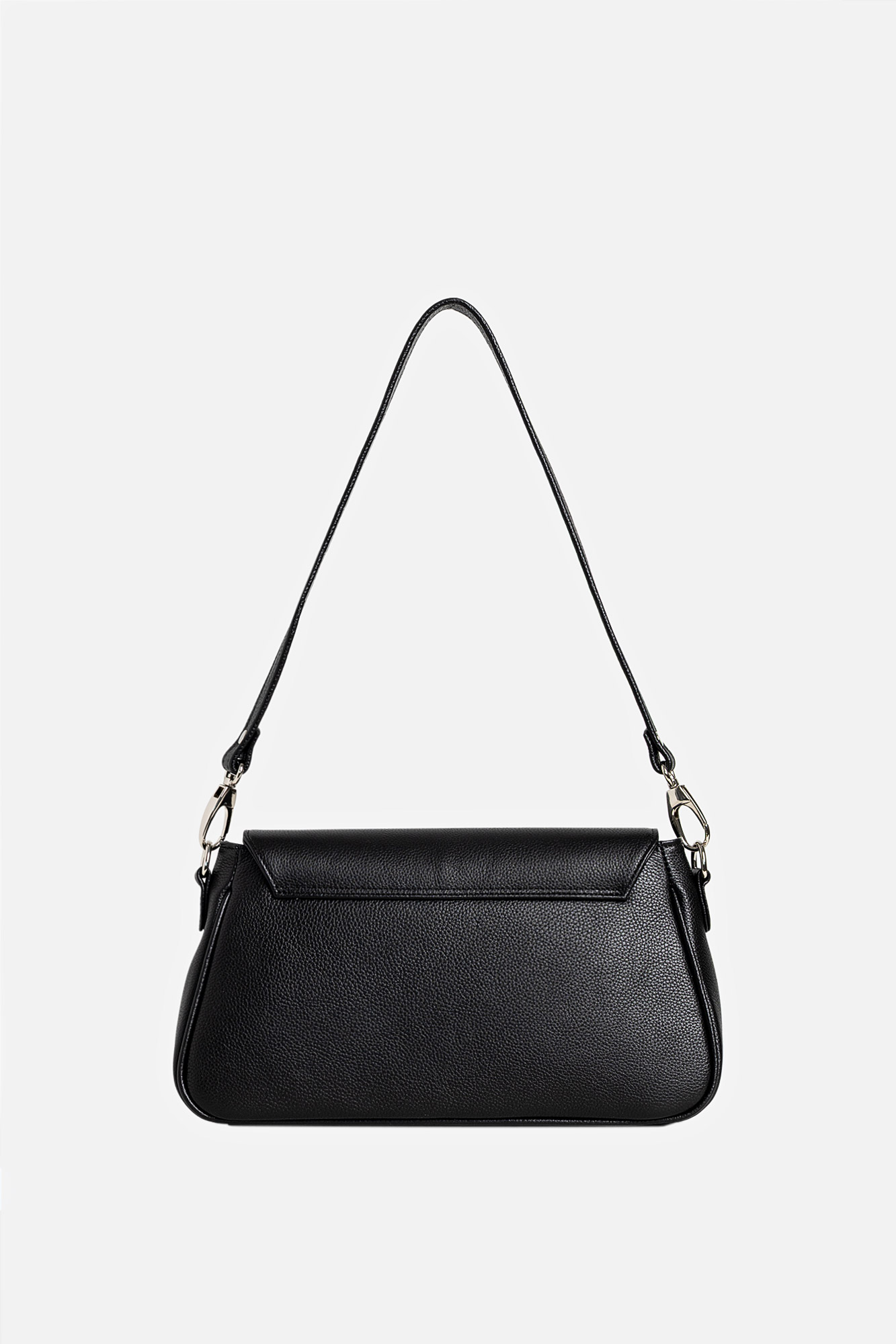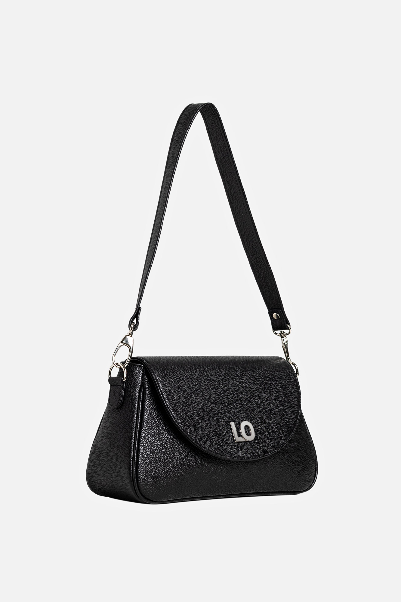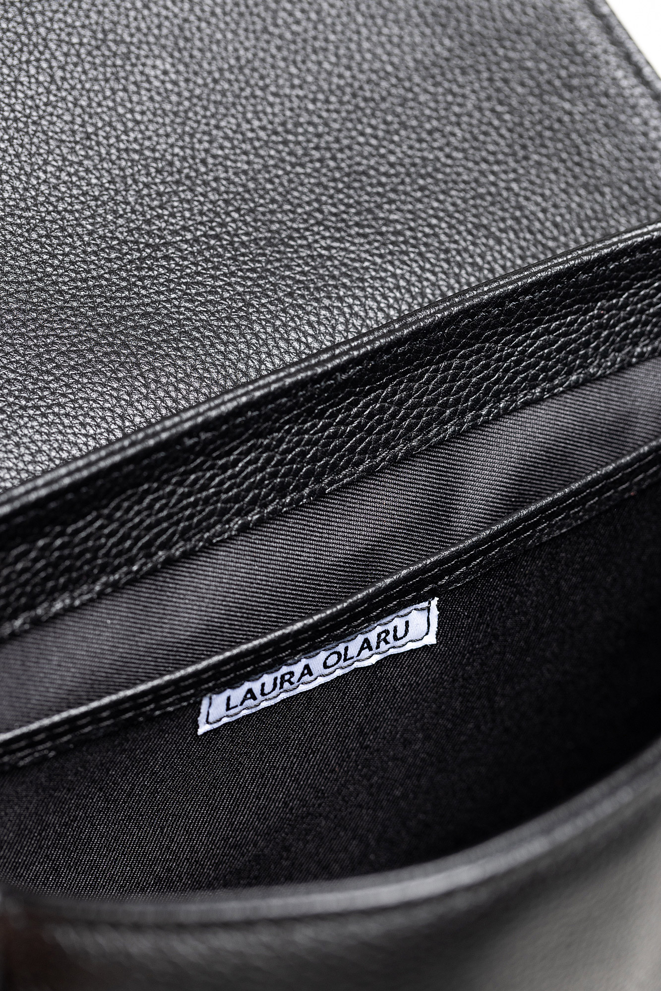 Geanta Leyla este realizată din piele naturală texturată neagră. Are un buzunar interior, se închide cu capsă magnetică și este accesorizată cu două barete detașabile: una scurtă și una lungă, reglabilă.