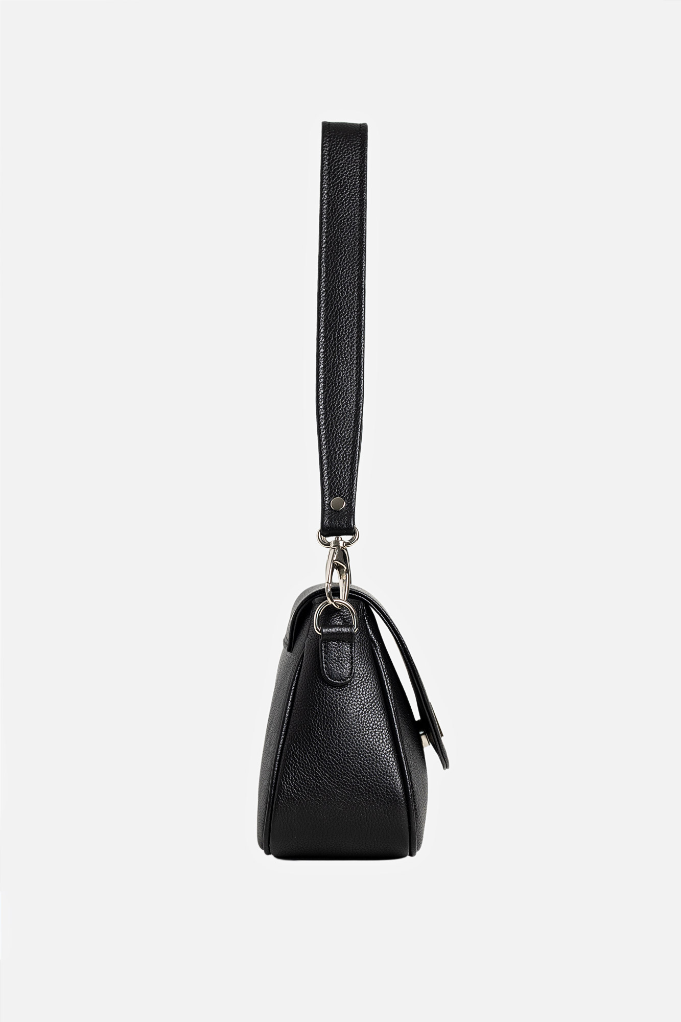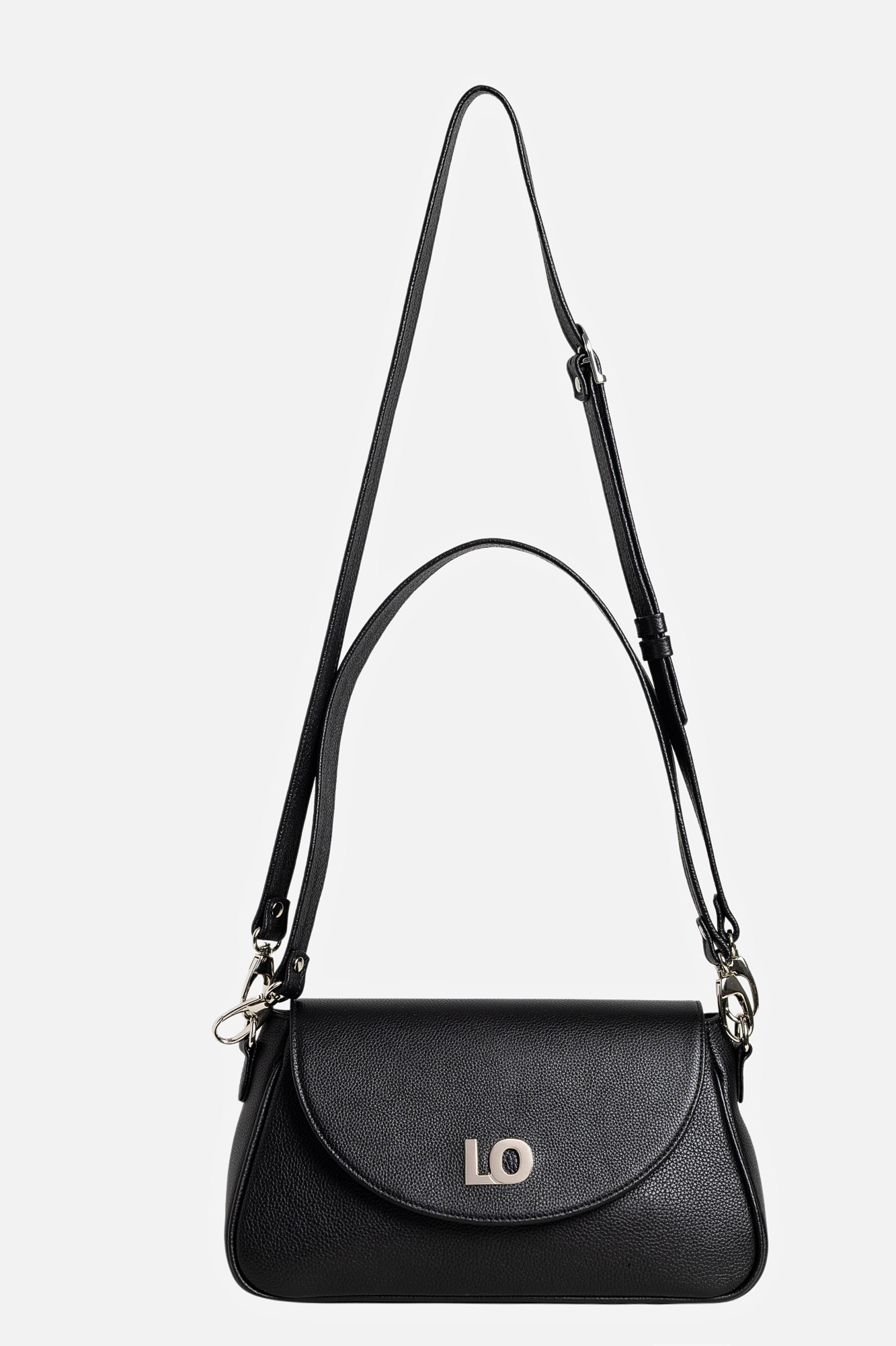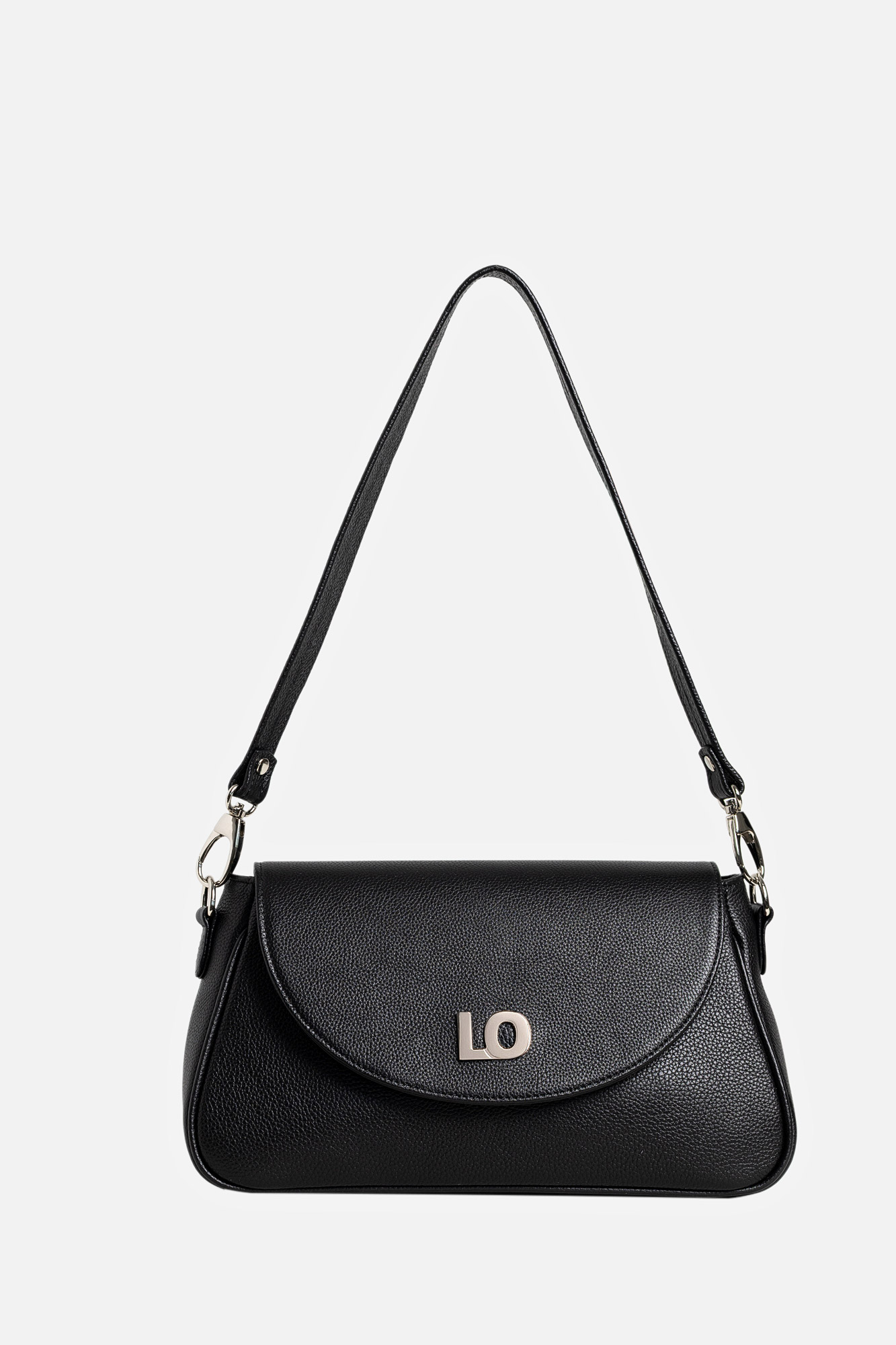 Geanta Leyla este realizată din piele naturală texturată neagră. Are un buzunar interior, se închide cu capsă magnetică și este accesorizată cu două barete detașabile: una scurtă și una lungă, reglabilă.