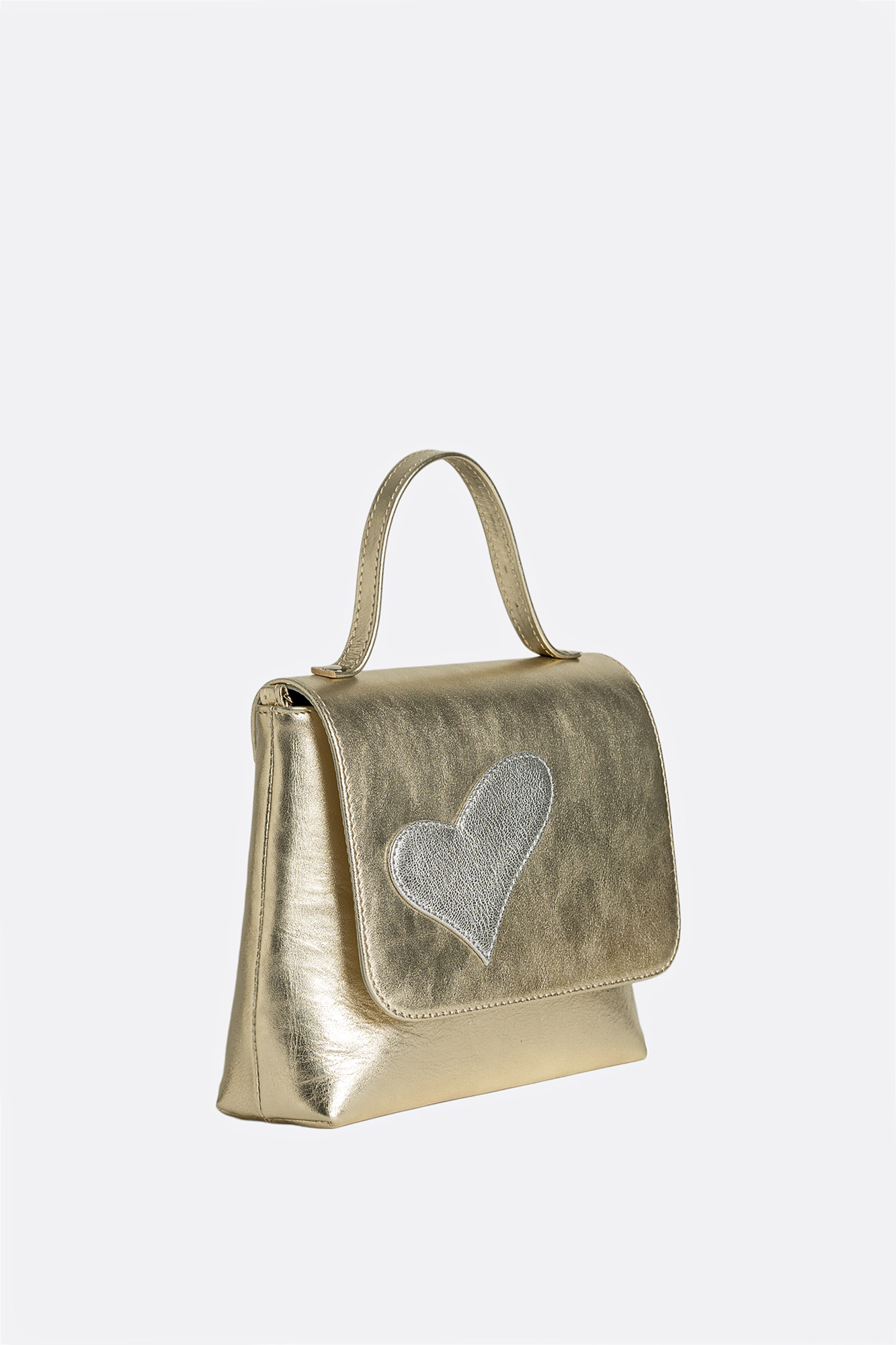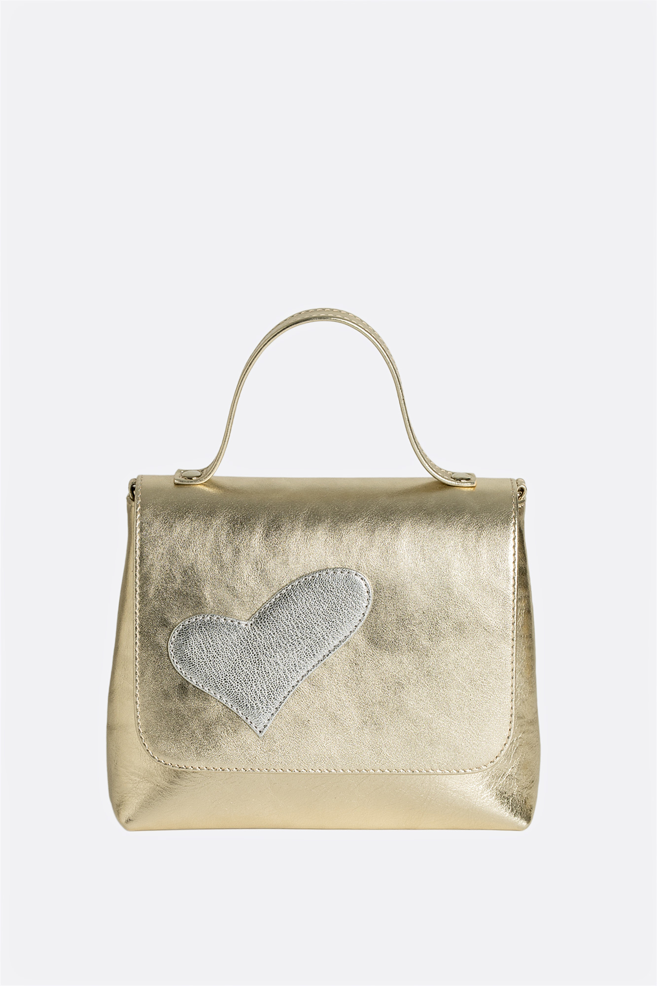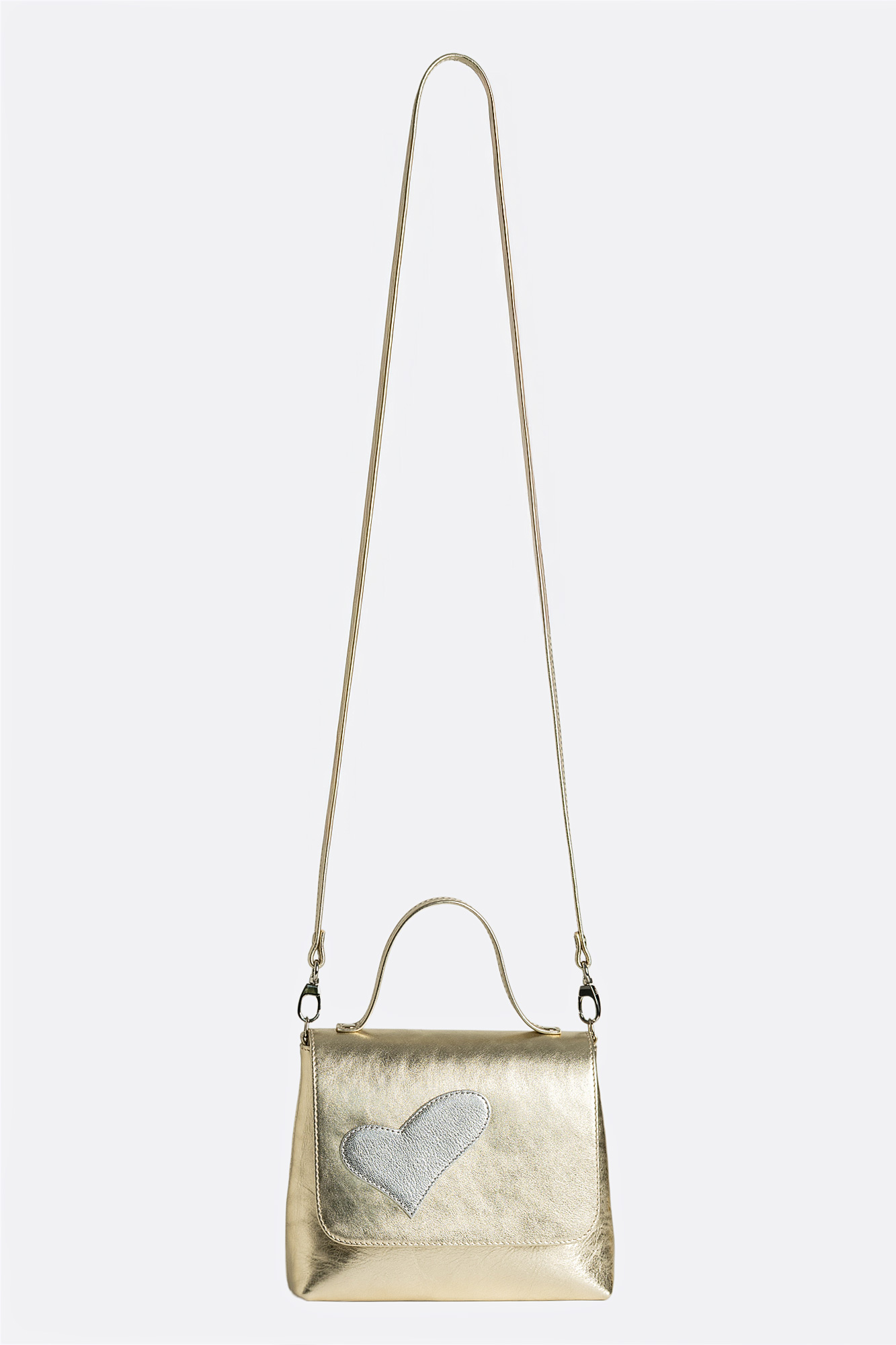 Geanta Mini Love are un design structurat, cu formă boxy, ce amintește de eleganța vintage a anilor ’50. Este realizată în România din piele naturală aurie și decorată cu o inimă rebelă argintie din piele, aplicată cu grijă în partea superioară.