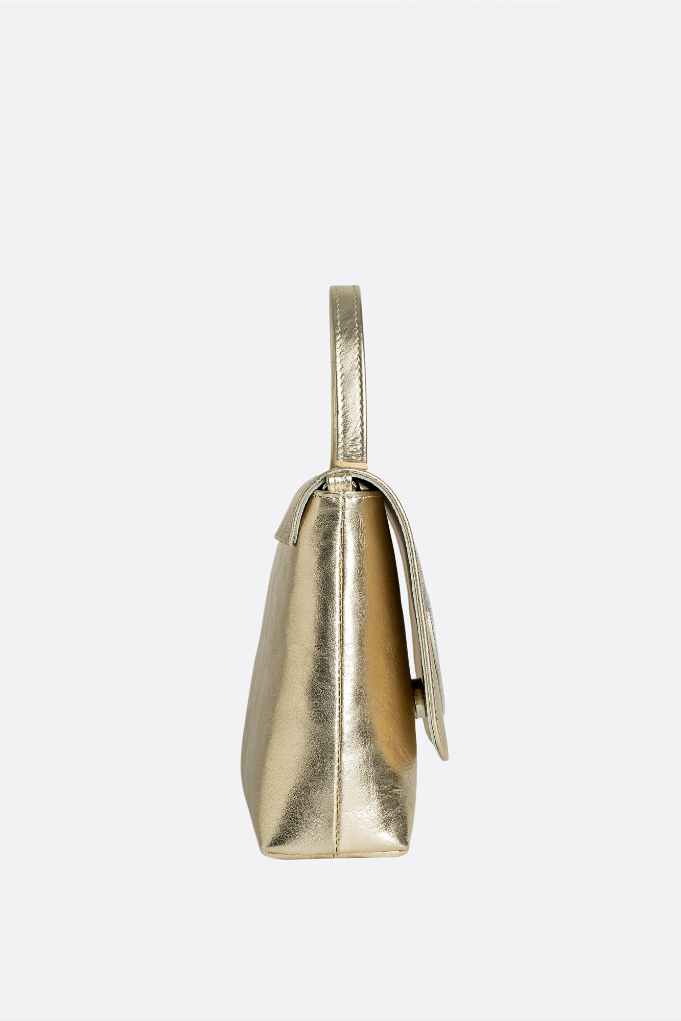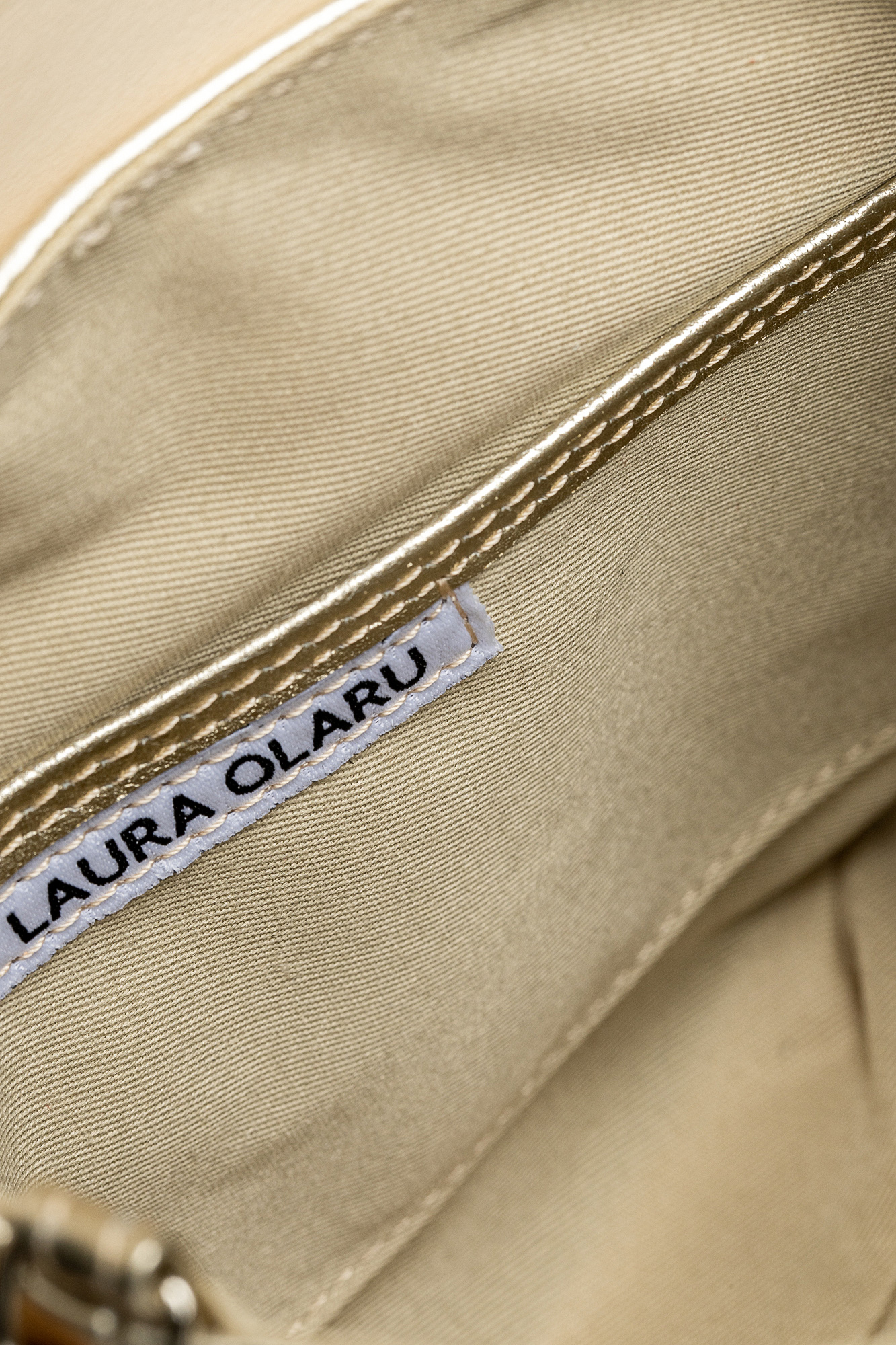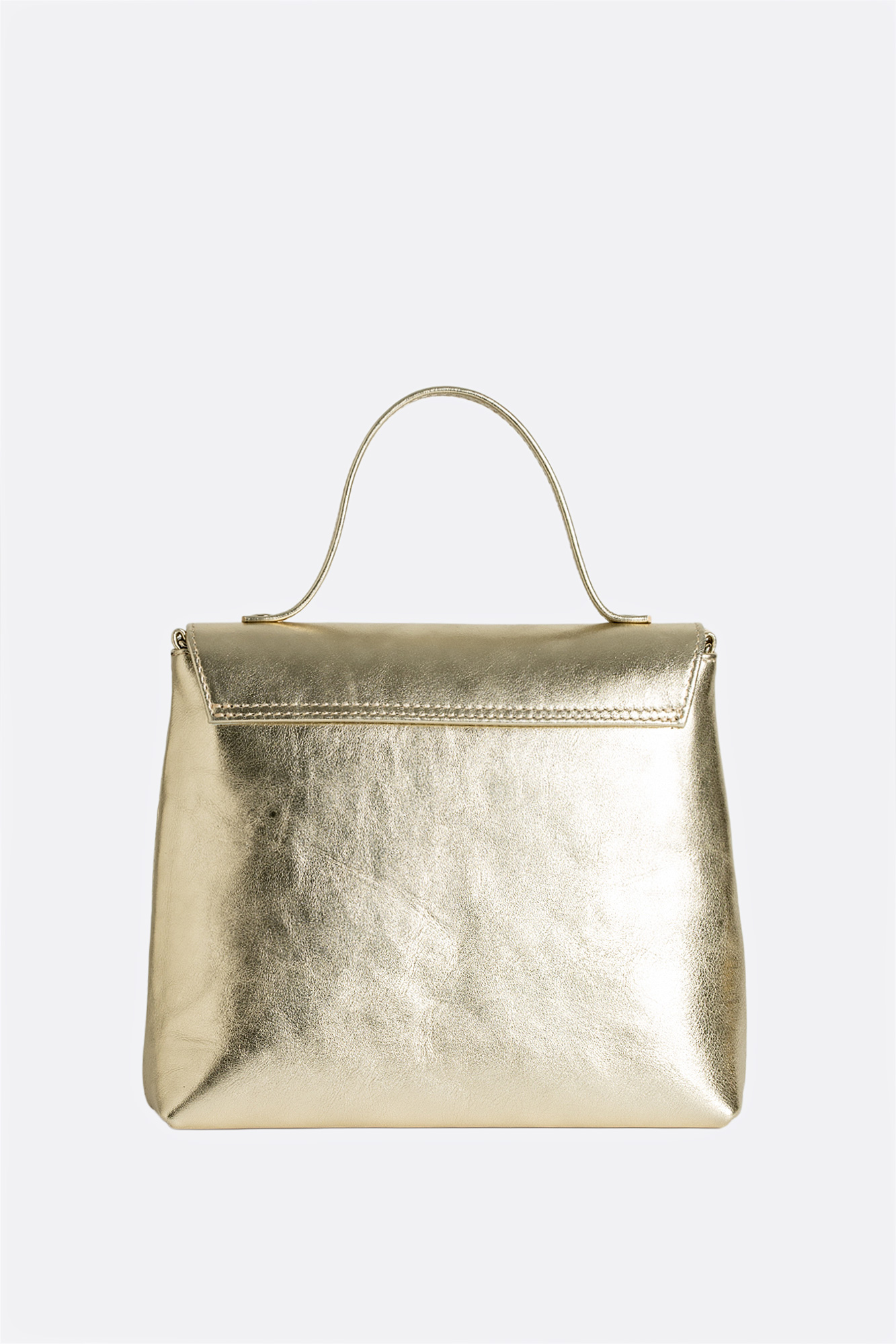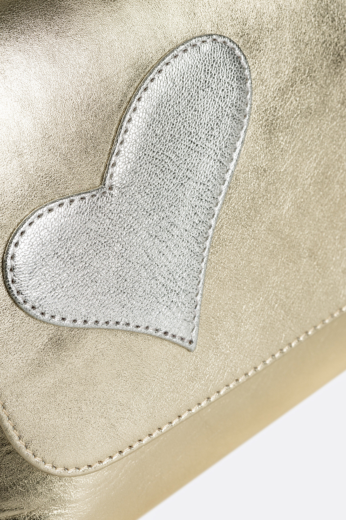 Geanta Mini Love are un design structurat, cu formă boxy, ce amintește de eleganța vintage a anilor ’50. Este realizată în România din piele naturală aurie și decorată cu o inimă rebelă argintie din piele, aplicată cu grijă în partea superioară.