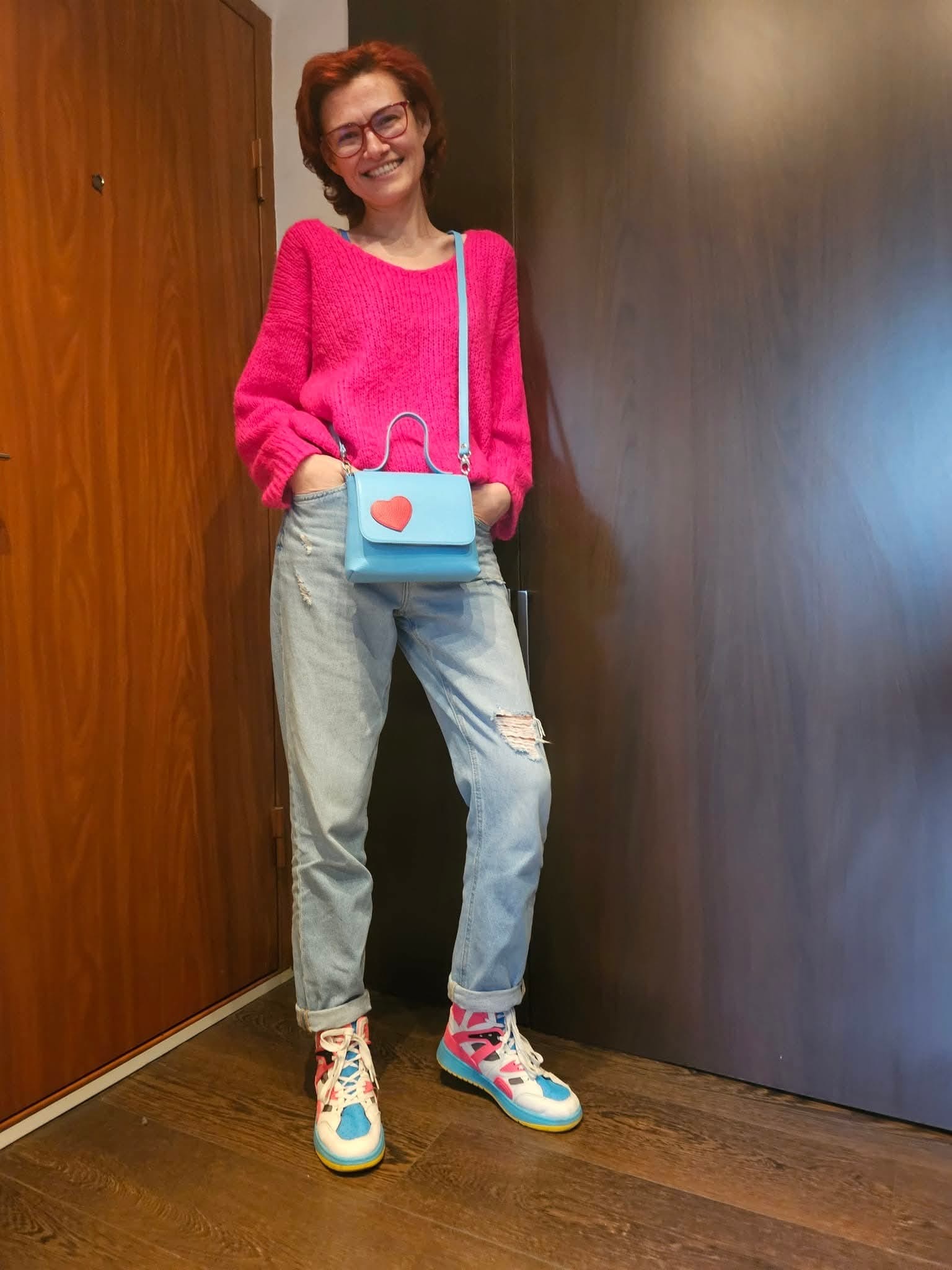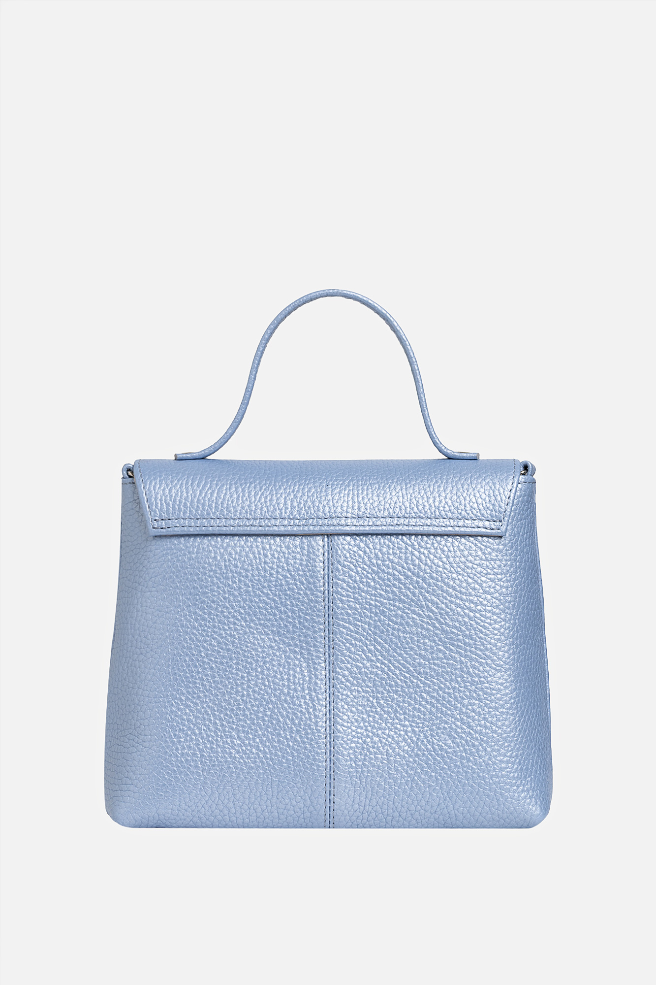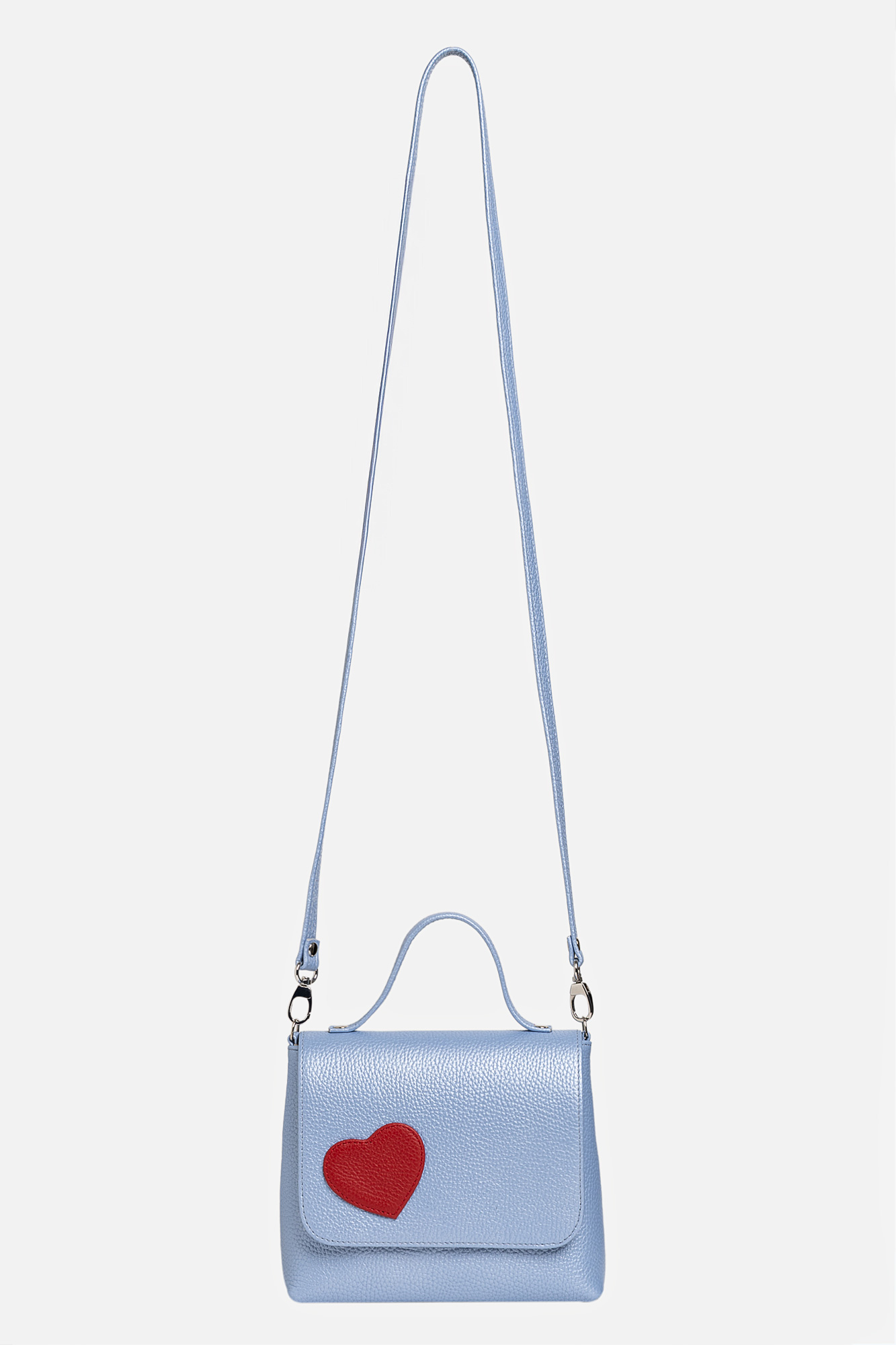 Geanta Mini Love are un design structurat, cu formă boxy, ce amintește de eleganța vintage a anilor ’50. Este realizată în România din piele naturală texturată bleu perlat și decorată cu o inimă roșie din piele, aplicată cu grijă în partea superioară.