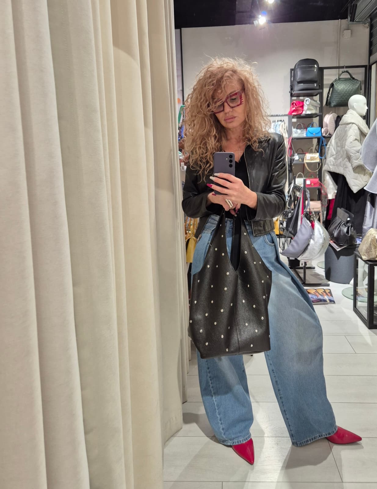 Geanta NOIRE este din piele naturală neagră, decorată cu ținte metalice pe față. Model încăpător, fără închidere, perfect pentru utilizare zilnică. În interior include un mini portofel pentru acte, ideal pentru organizarea articolelor esențiale. Atracția principală a colecției NOIRE EDGE este o piesă statement, cu un look modern și edgy.