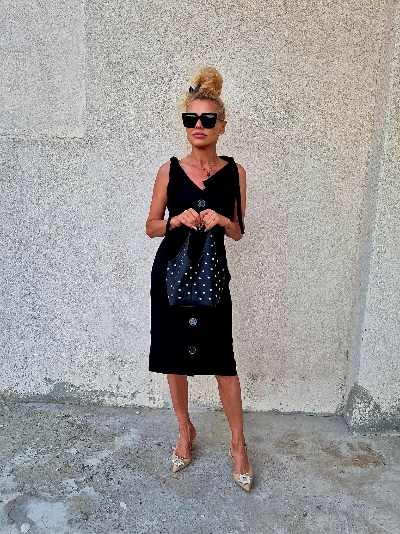 Geanta NOIRETTE, tip mini sack, este din piele naturală neagră și face parte din colecția NOIRE EDGE. Decorată cu ținte metalice pe față, păstrează look-ul edgy al modelului NOIRE, într-un format mai compact. Este ideală pentru esențialele de zi cu zi. O piesă statement, modernă și ușor de purtat.