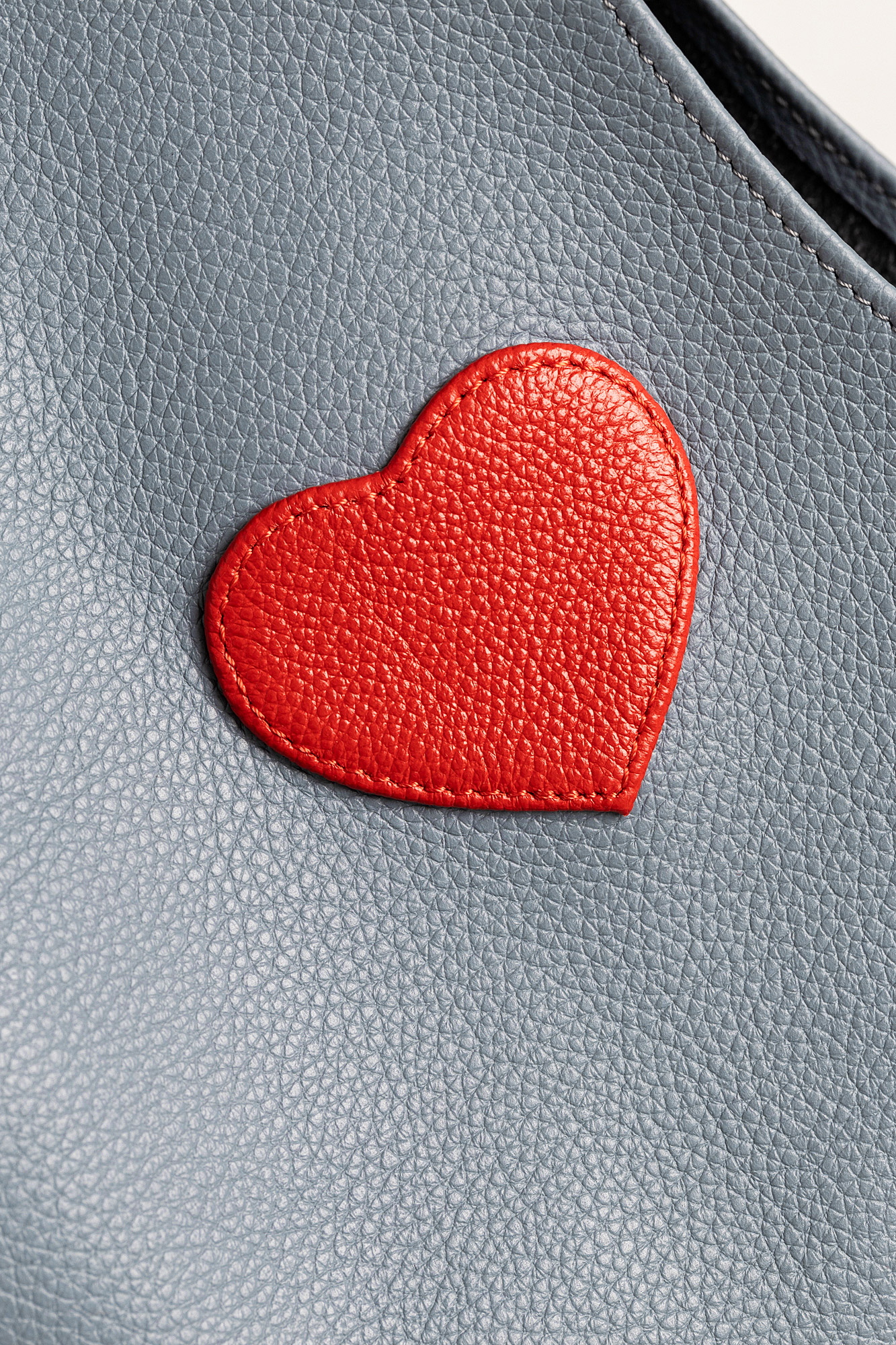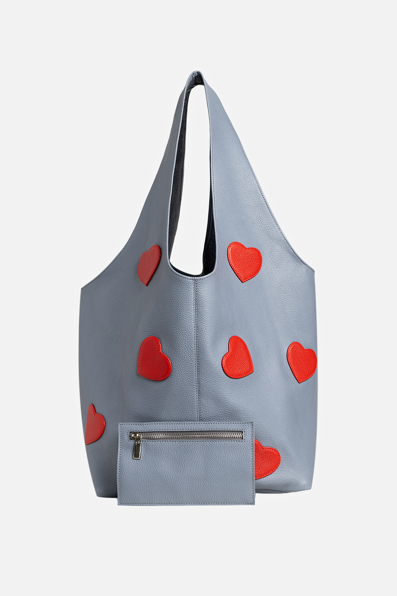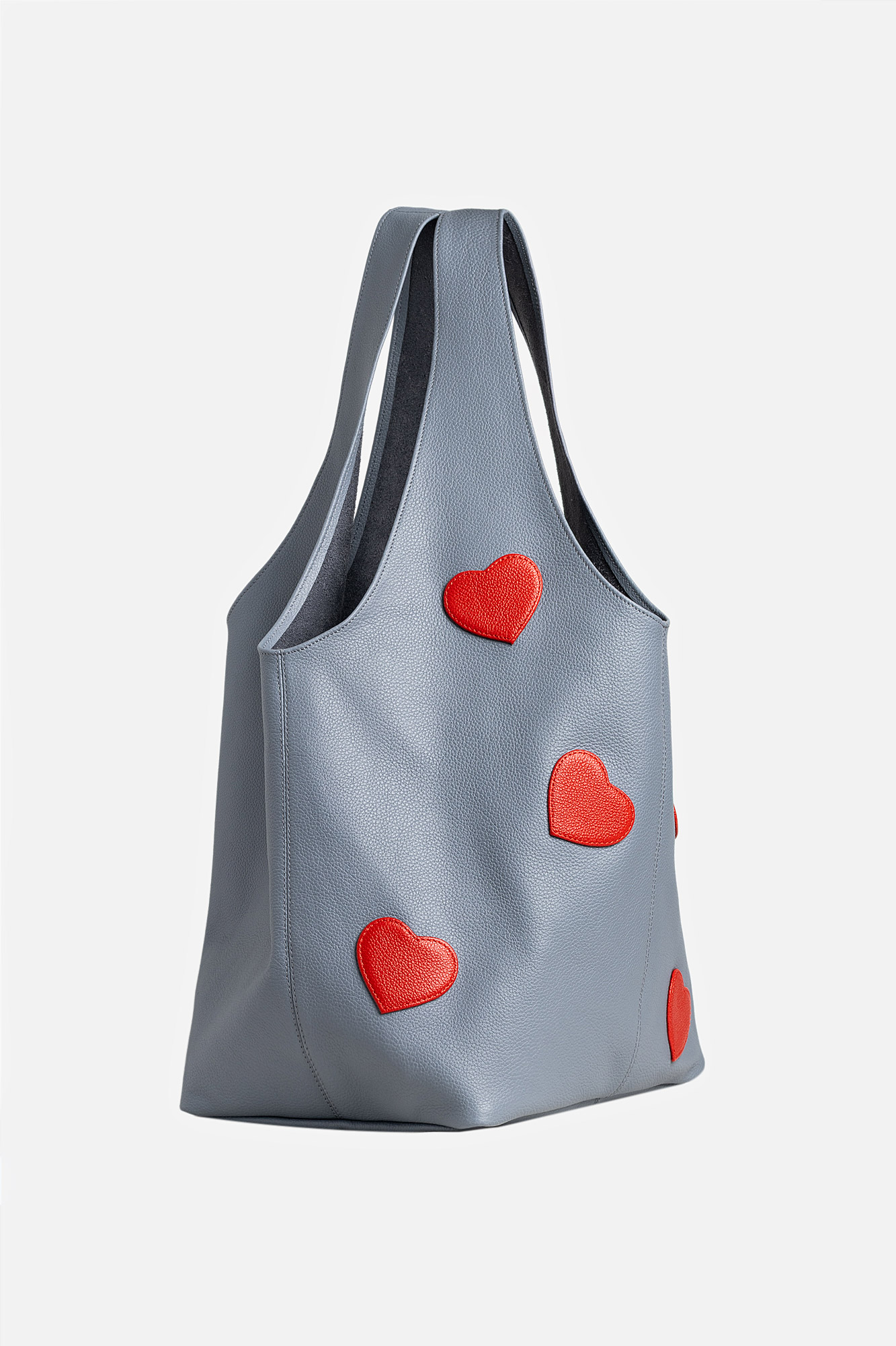 Pe una dintre fețe, geanta are inimioare roșii aplicate manual. Poți alege să le porți la vedere sau nu, în funcție de dispoziția ta, întorcând geanta pe cealaltă parte.