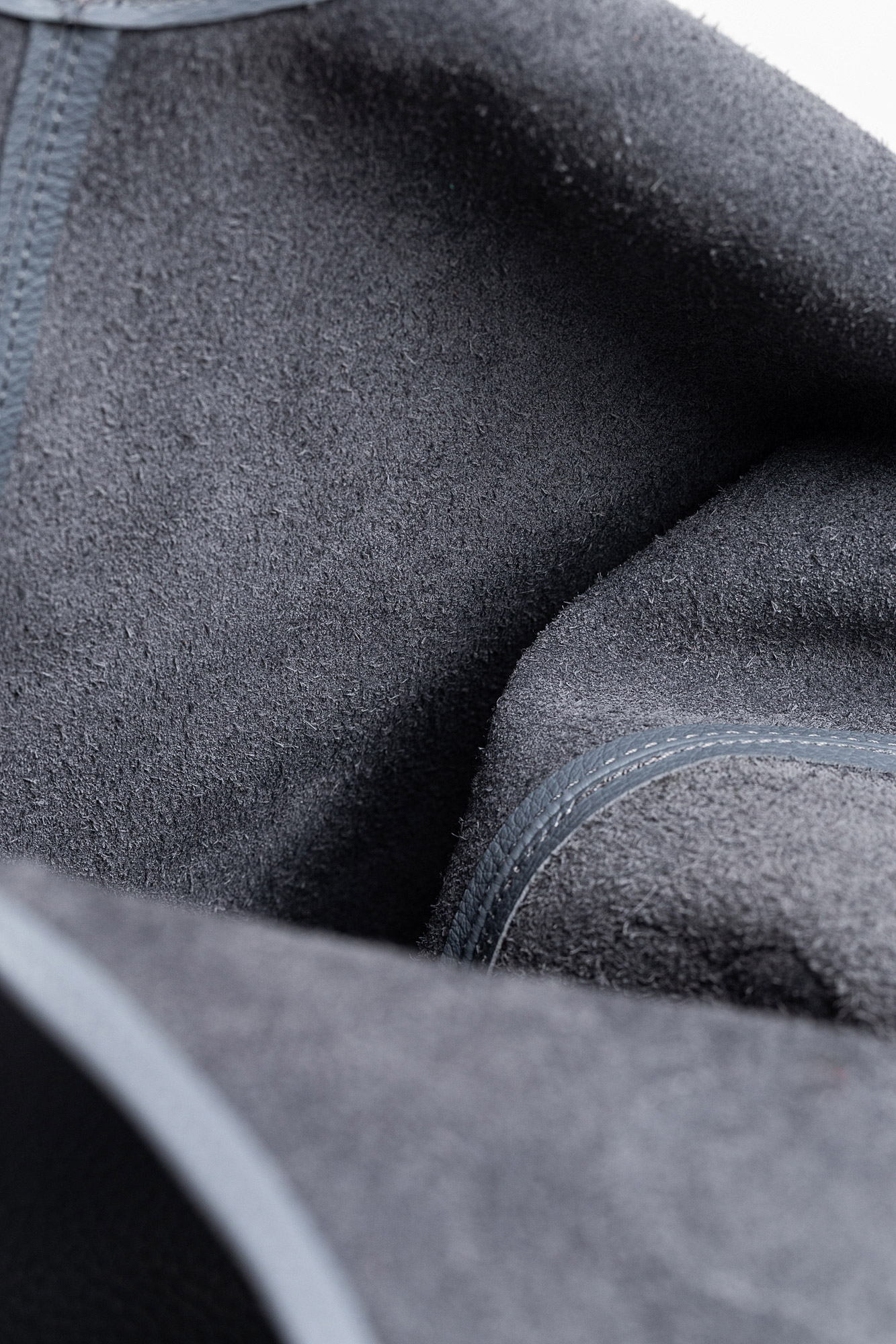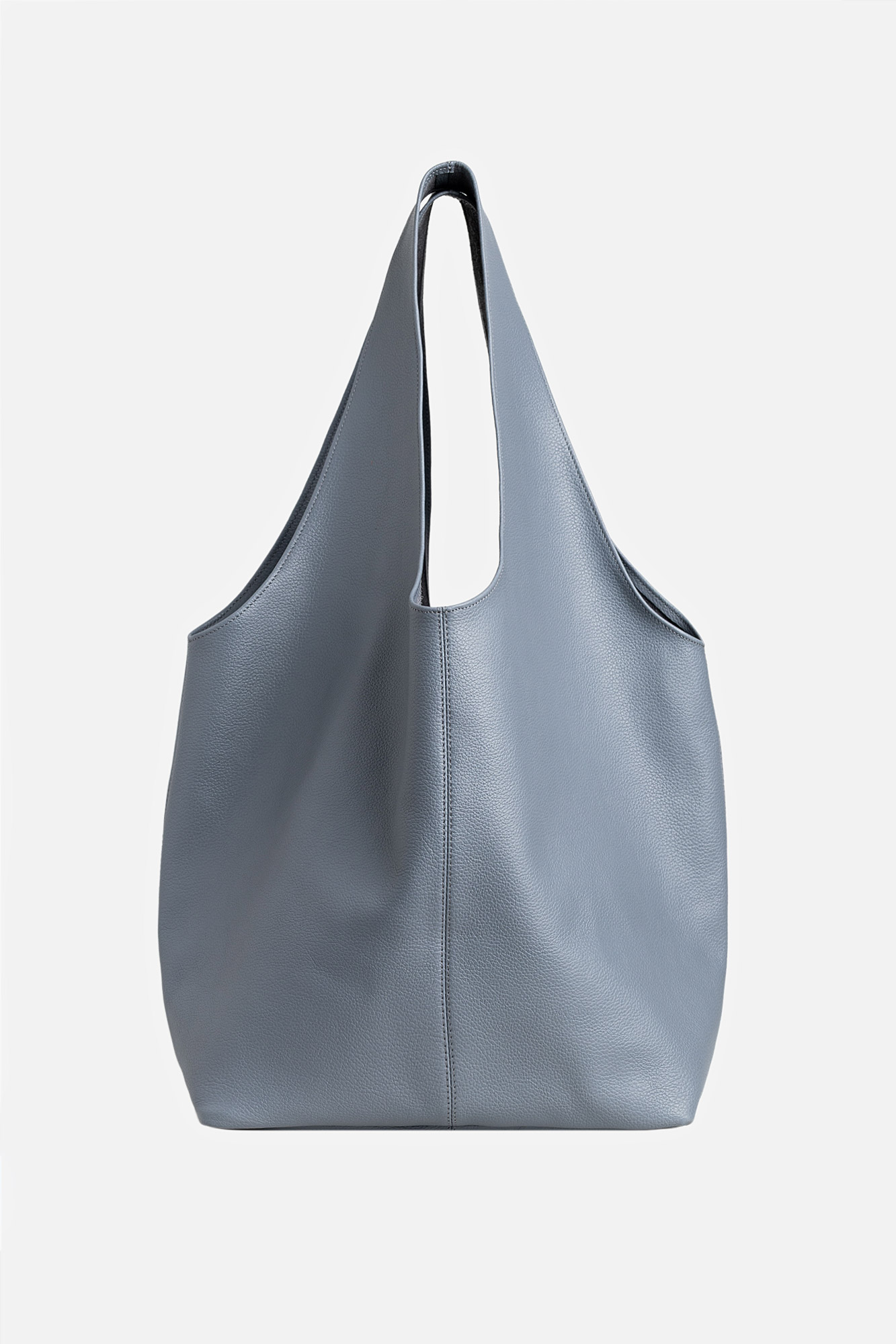 Geanta Sack fără structură este confecționată din piele naturală gri, cu textură subtilă. Spațioasă și practică, este suficient de mare pentru a încăpea telefonul, portofelul, o sticlă de apă și chiar un laptop standard. Designul este lăsat necăptușit, pentru a fi cât mai ușoară.