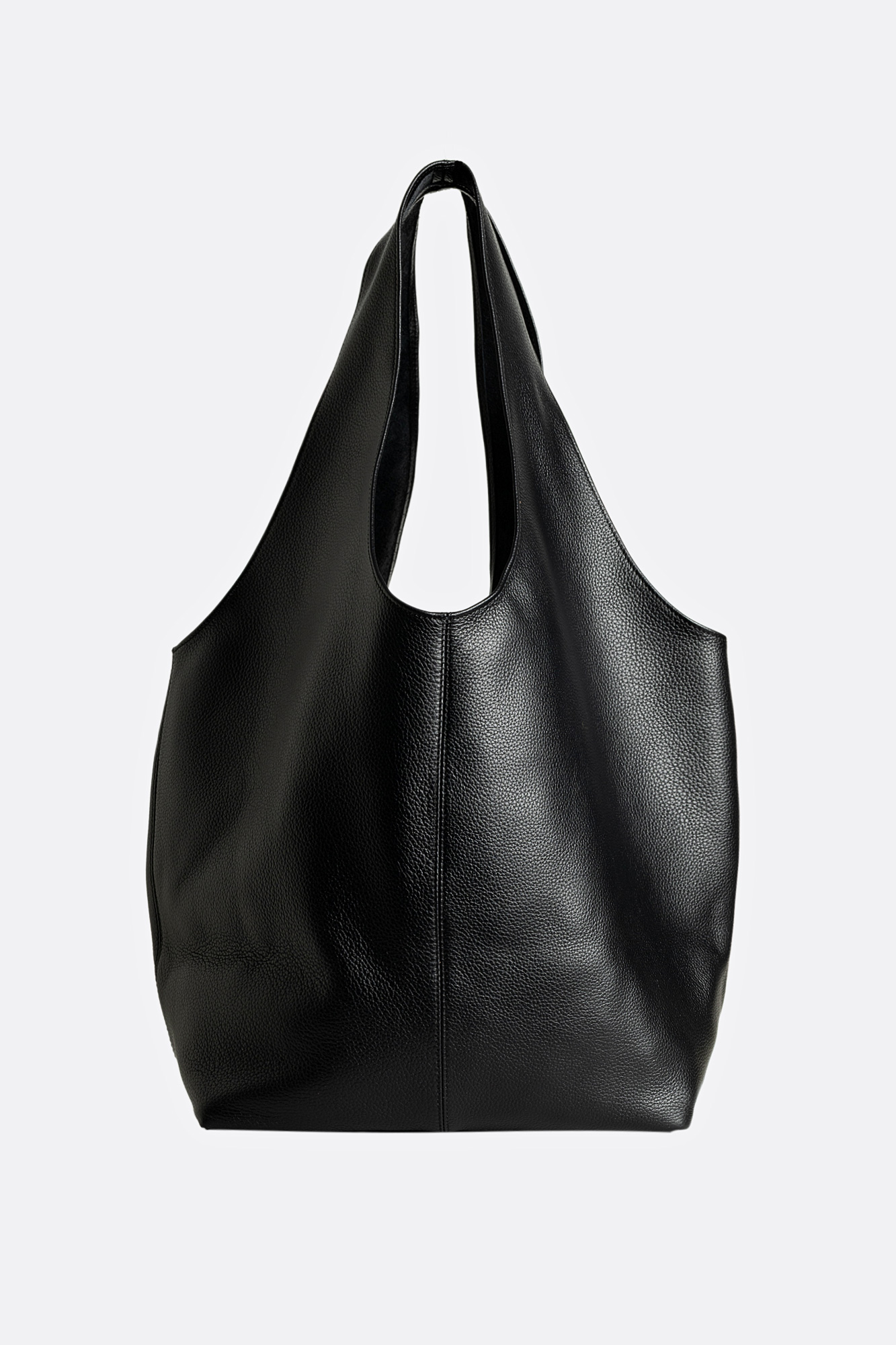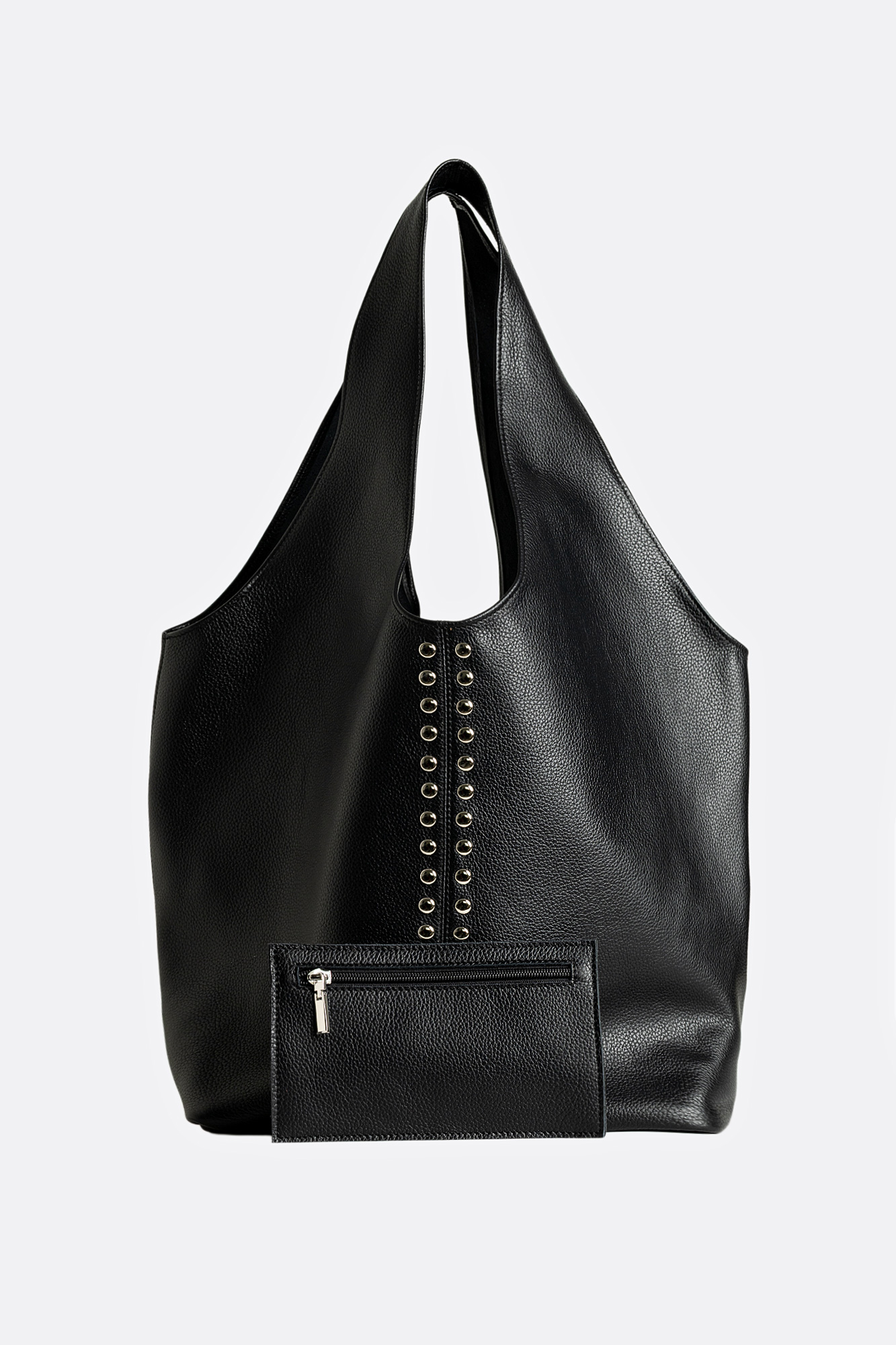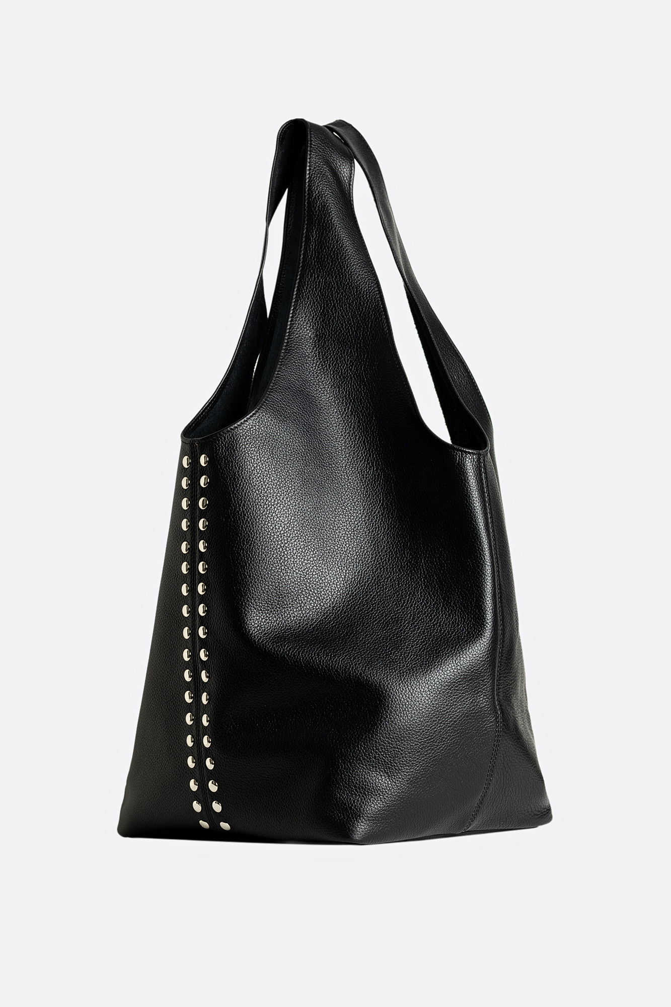 Geanta SACK este din piele naturală neagră, decorată cu capse metalice, pe față. Model încăpător, fără închidere, perfect pentru utilizare zilnică. În interior include un mini portofel pentru acte, ideal pentru organizarea articolelor esențiale. Este o piesă statement, cu un look modern și edgy.