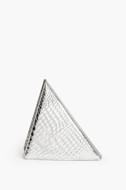 Geanta TRIANGLE este realizată din piele naturală aurie cu presaj tip croco.