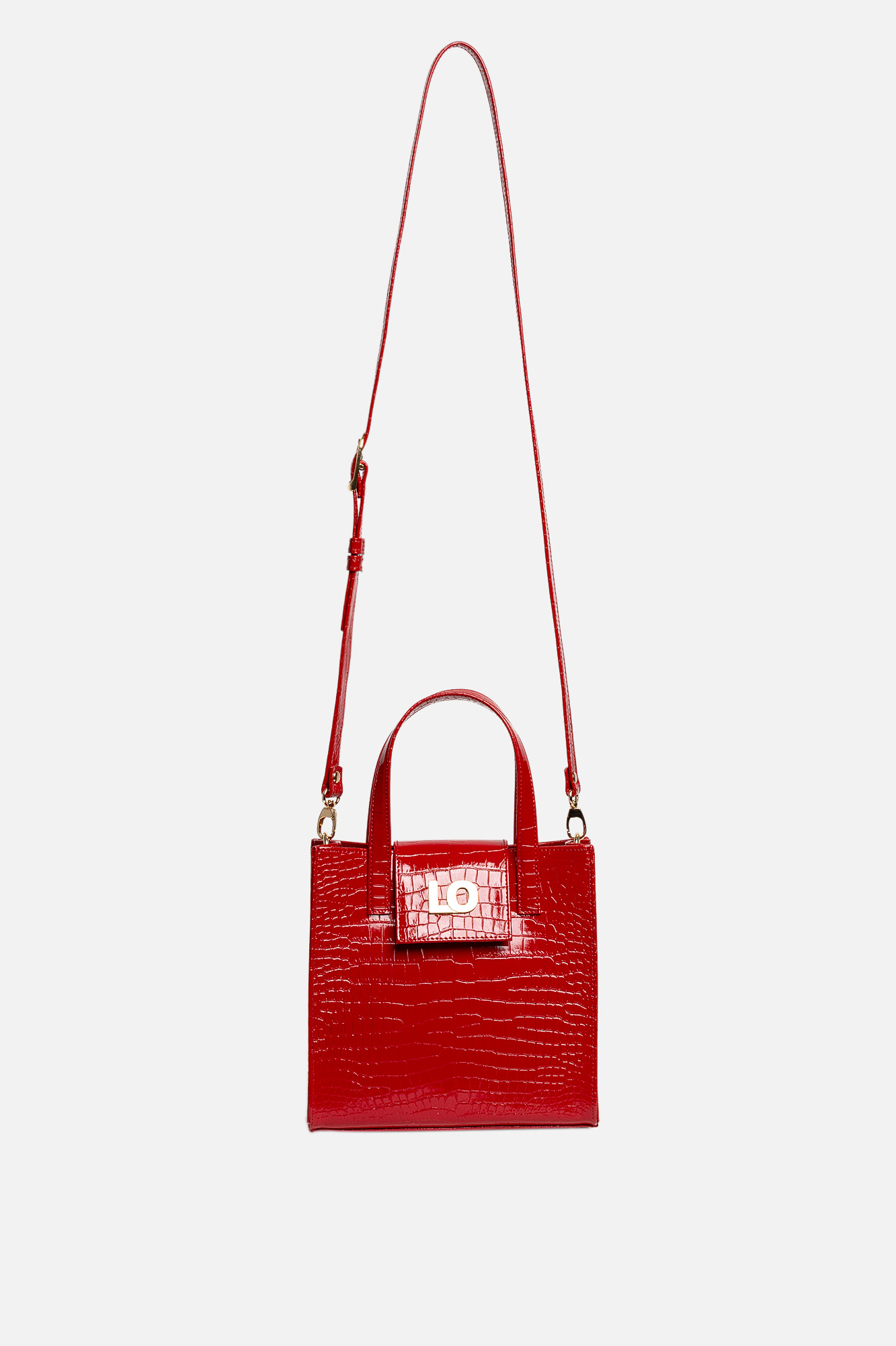 Geanta ZITTA este realizată din piele naturală roșie cu presaj croco, are două buzunare interioare, două barete de mână scurte plus baretă lungă de umăr reglabilă, se închide cu o clapă prevăzută cu capsă magnetică care poartă logo ul brandului.
